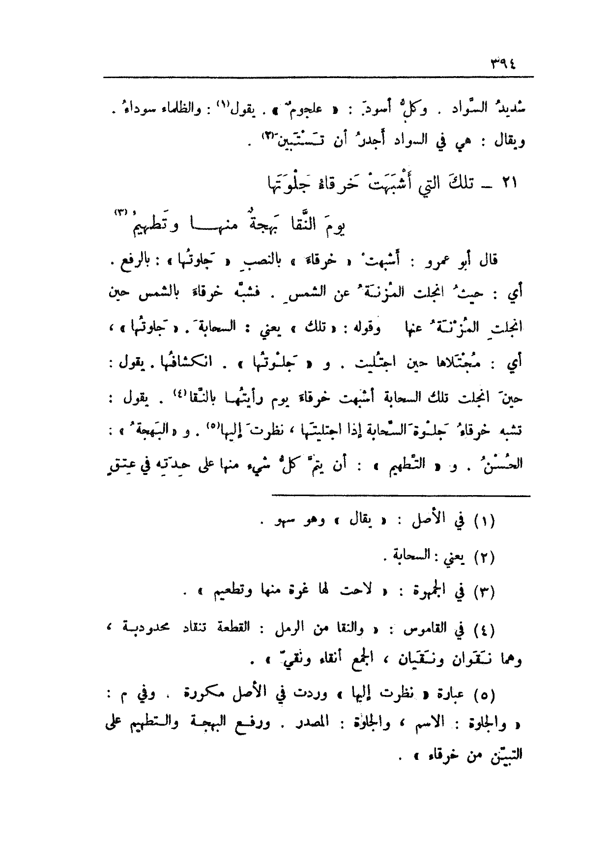 قال أبو عمرو: أشبهت "خرقاء" بالنصب "جلوتها": بالرفع. أي: حيث انجلت المزنة عن الشمس. فشبه خرقاء بالشمس حين انجلت المزنة عنها وقوله: "تلك" يعني: السحابة. "جلوتها"، أي: مجتلاها حين اجتليت. و"جلوتها". انكشافها. يقول: حين انجلت تلك السحابة أشبهت خرقاء يوم رأيتها بالنقا. يقول: تشبه خرقاء جلوة السحابة إذا اجتليتها، نظرت إليها. و"البهجة": الحسن. و"التطهيم": أن يتم كل شيء منها على حدته في عتقٍ
