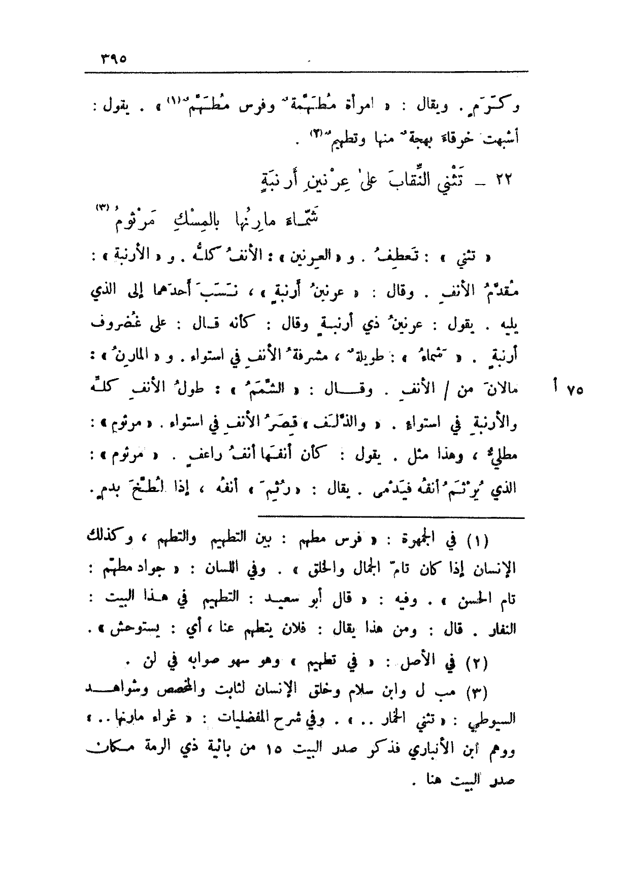 "تثني": تعطف. و"العرنين": الأنف كله. و"الأرنبة": مقدم الأنف. وقال: "عرنين أرنبةٍ"، نسب أحدهما إلى الذي يليه. يقول: عرنين ذي أرنبةٍ وقال: كأنه قال: على غضروف أرنبةٍ. "شماء": طويلةٌ، مشرفة الأنف في استواء. و"المارن": مالان من 75 أ/ الأنف. وقال: "الشمم": طول الأنف كله والأنربة في استواءٍ. "والذلف" قصر الأنف في استواء. "مرثوم": مطليٌّ، وهذا مثل. يقول: كأن أنفها أنف راعفٍ. "مرثوم": الذي يُرثم أنفه فيدمى. يقال: "رُثم" أنفه، إذا لطخ بدمٍ.