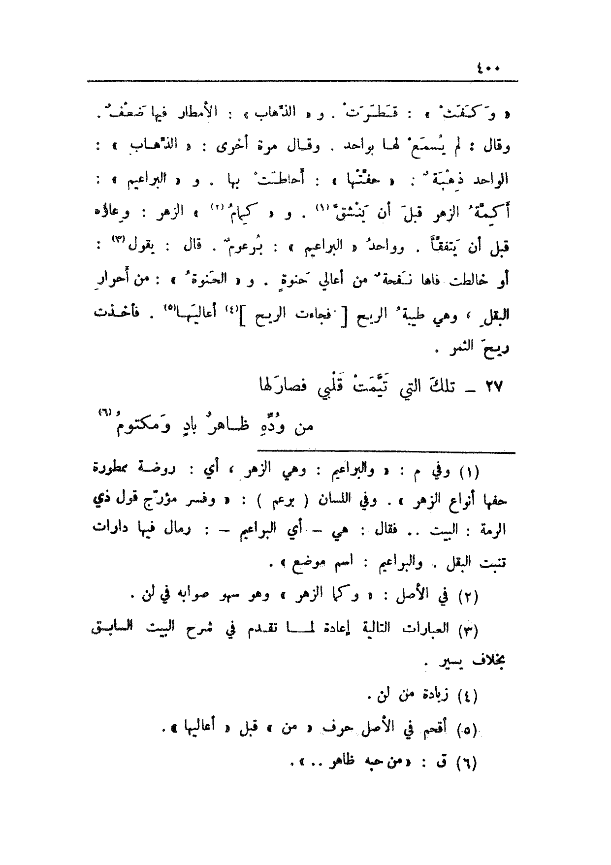 "وكفت": قطرت. و"الذهاب": الأمطار فيها ضعف. وقال: لم يسمع لها بواحد. وقال مرة أخرى: "الذهاب": الواحد ذهبةٌ: "حفتها": أحاطت بها. و"البراعيم": أكمة الزهر قبل أن ينشق. و"كمام" الزهر: وعاؤه قبل أن يتفقا. وواحد "البراعيم": برعومٌ. قال: يقول: أو خالطت فاها نفحةٌ من أعالي حنوةٍ. و"الحنوة": من أحرار البقل، وهي طيبة الريح [فجاءت الريح] أعاليها. فاخذت ريح الثمر.