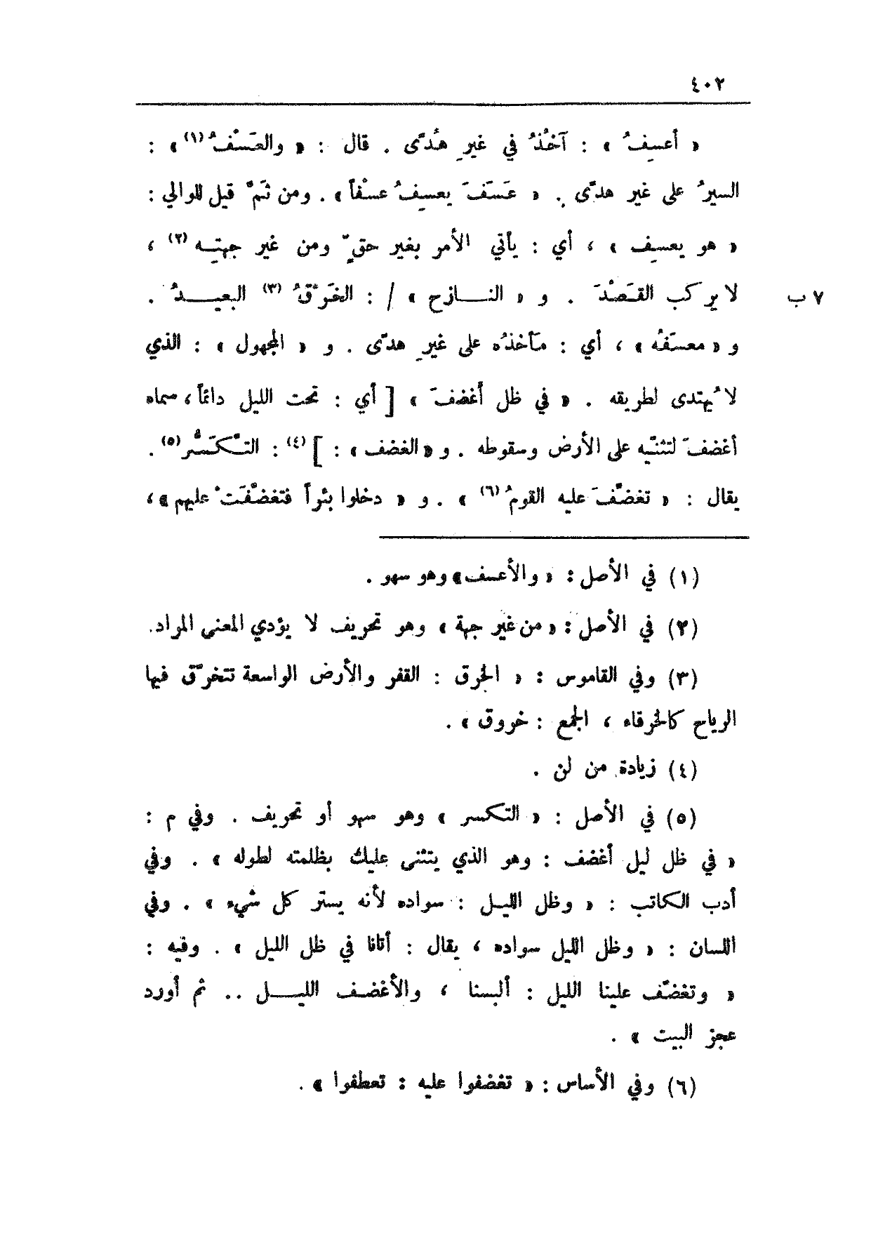 "أعسف": آخذ في غير هدى. قال: "والعسف": السير على غير هدى. "عسف يعسف عسفاً". ومن ثم قيل للوالي: "هو يعسف"، أي: يأتي الأمر بغير حقٍ ومن غير جهته، لا يركب القصد. و"النازح" 76 ب/: الخرق البعيد. و"معسفه"، أي: مأخذه على غير هدى. و"المجهول": الذي لا يهتدى لطريقه. "في ظل أغضف" [أي: تحت الليل دائماً، سماه أغضف لتثنيه على الأرض وسقوطه. و"الغضف":]: التكسر. يقال: "تغضف عليه القوم". و"دخلوا بئراً فتغضفت عليهم"،