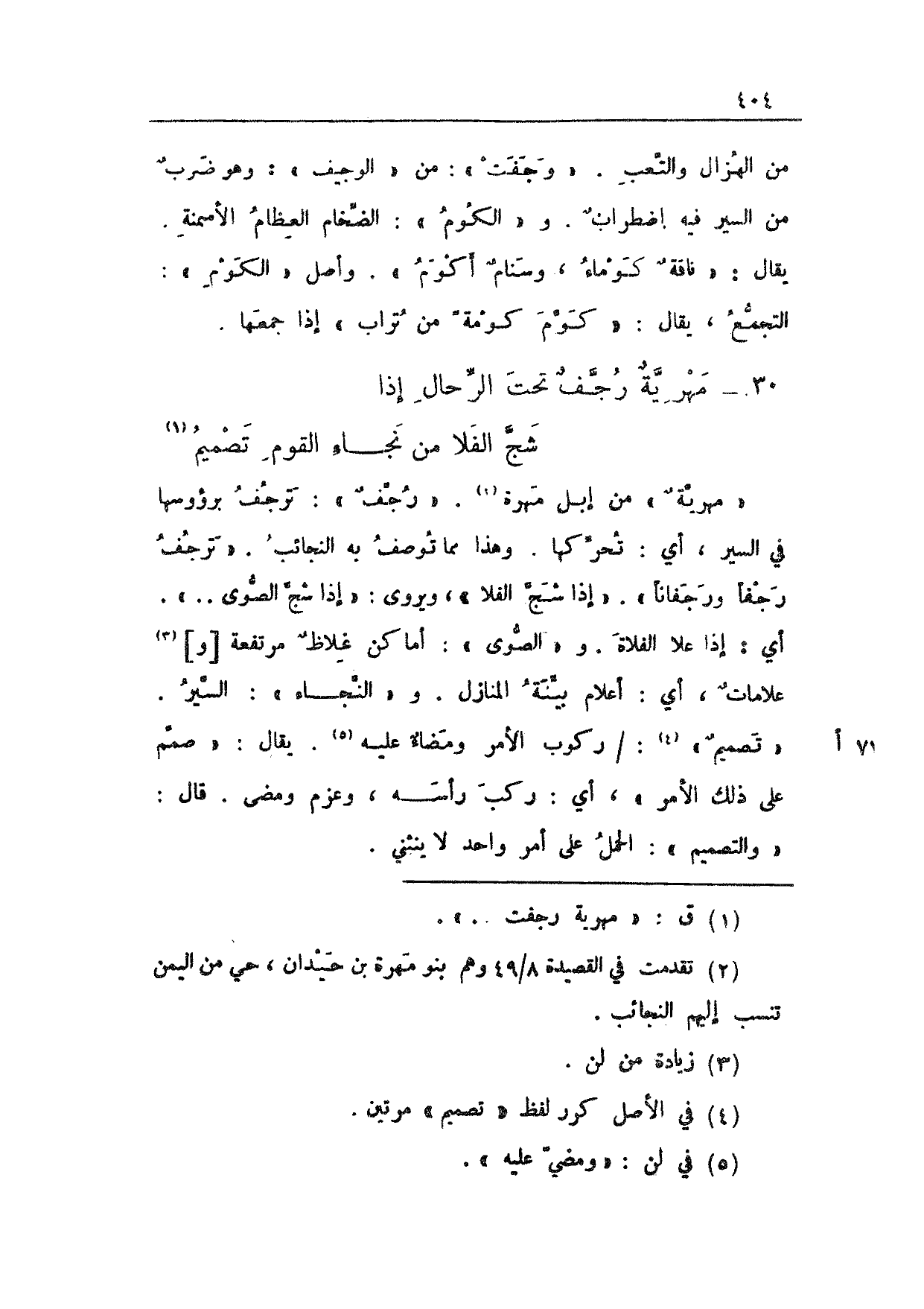 "مهريةٌ" من إبل مهرة. "رجفٌ": ترجف برؤوسها في السير، أي: تحركها. وهذا مما توصف به النجائب. "ترجف رجفاً ورجفاناً". "إذا شج الفلا"، ويروى: "إذا شج الصوى .. ". أي: إذا علا الفلاة. و"الصوى": أماكن غلاظٌ مرتفعة [و] علاماتٌ، أي: أعلام بينة المنازل. و"النجاء": السير. "تصميمٌ": 77 أ/ ركوب الأمر ومضاءٌ عليه. يقال: "صمم على ذلك الأمر"، أي: ركب رأسه، وعزم ومضى. قال: "والتصميم": الحمل على أمر واحد لا ينثني.