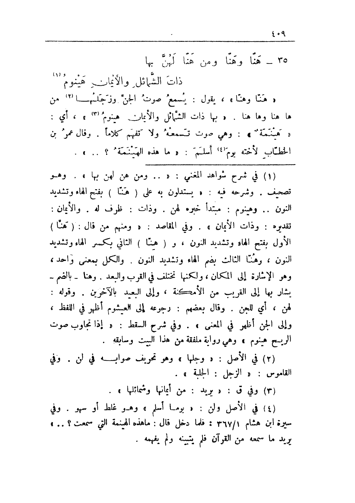 "هنا وهنا"، يقول: يسمع صوت الجن وزجلها من ها هنا وها هنا. "بها ذات الشمائل والأيمان هينوم"، أي: "هينمةٌ": وهي صوت تسمعه ولا تفهم كلاماً. وقال عمر بن الخطاب لأخته يوم أسلم: "ما هذه الهينمة؟ .. ".