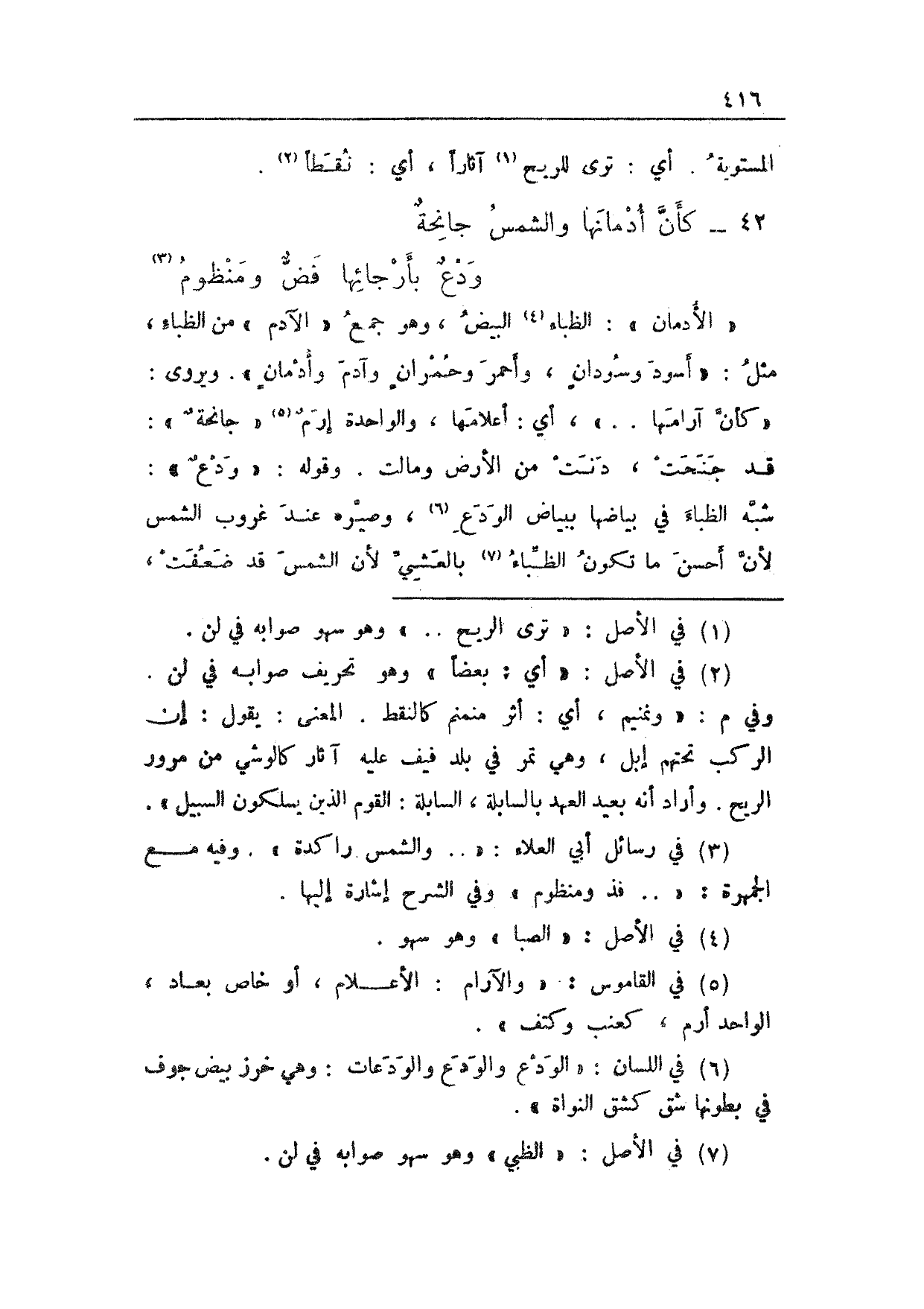 "الأدمان": الظباء البيضُ، وهو جمعُ "الآدم" من الظباء، مثل: "أسود وسودانٍ، وأحمر وحمرانٍ وآدم وأُدمانٍ". ويروى: "كأن آرامها .. "، أي: أعلامها، والواحدة إرمٌ "جانحةٌ": قد جنحت، دنت من الأرض ومالت. وقوله: "ودعٌ": شبه الظباء في بياضها ببياض الودع، وصيره عند غروب الشمس لأن أحسن ما تكون الظباء بالعشي لأن الشمس قد ضعفت،