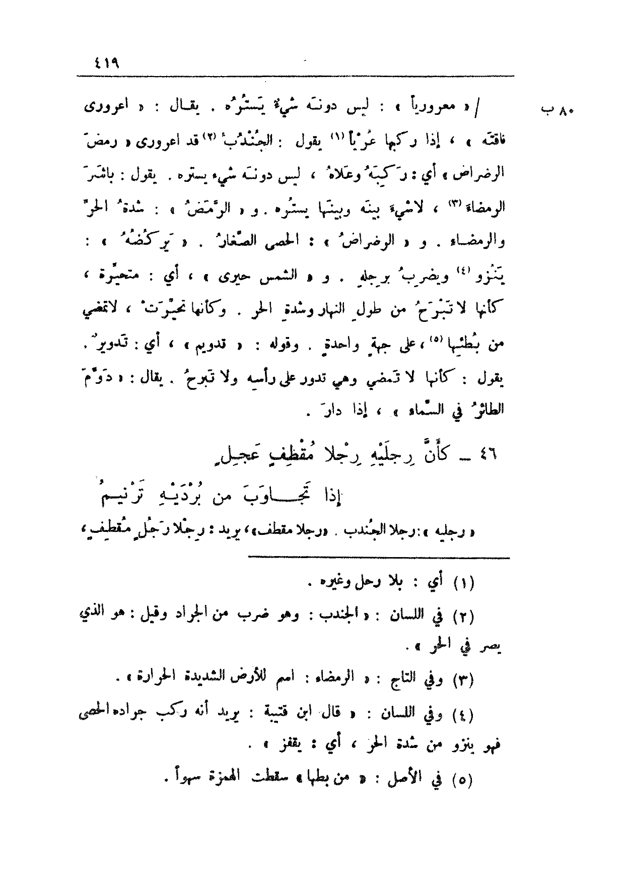 80 ب/ "معرورياً": ليس دونه شيءٌ يستره. يقال: "اعرورى فاقته"، إذا ركبه عرياً يقول: الجندب قد اعرورى "رمض الرضراض" أي: ركبه وعلاه، ليس دونه شيء يستره. يقول: باشر الرمضاء، لا شيء بينه وبينها يستره. و"الرمض": شدة الحر والرمضاء. و"الرضراض": الحصى الصغار. "يركضه": ينزو ويضرب برجله. و"الشمس حيرى"، أي: متحيرة، كأنها لا تبرح من طول النهار وشدة الحر. وكأنها تحيرت، لا تمضي من بطئها، على جهةٍ واحدةٍ. وقوله: "تدويم"، أي: تدويرٌ. يقول: كأنها لا تمضي وهي تدور على رأسه ولا تبرح. يقال: "دوم الطائر في السماء"، إذا دار.