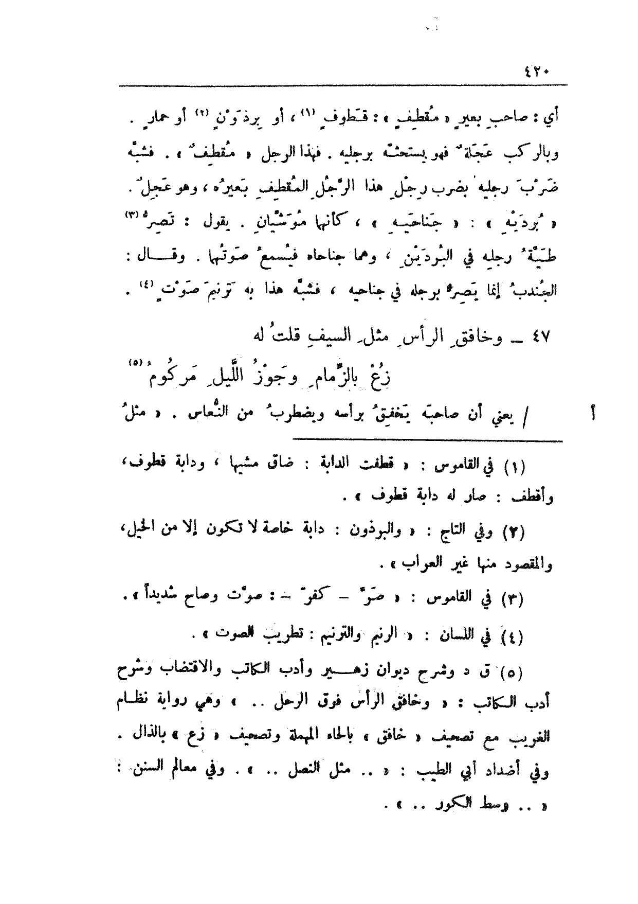 أي: صاحب بعيرٍ "مقطفٍ": قطوفٍ، أو برذونٍ أو حمارٍ. وبالركب عجلةٌ فهو يستحثه برجليه. فهذا الرجل "مقطفٌ". فشبه ضرب رجليه بضرب رجل هذا الرجل المقطف بعيره، وهو عجلٌ. "برديه": "جناحيه"، كأنهما موشيان. يقول: تصر طية رجله في البردين، وهما جناحاه فيسمع صوتهما. وقال: الجندب إنما يصر برجله في جناحيه، فشبه هذا به ترنيم صوتٍ.
