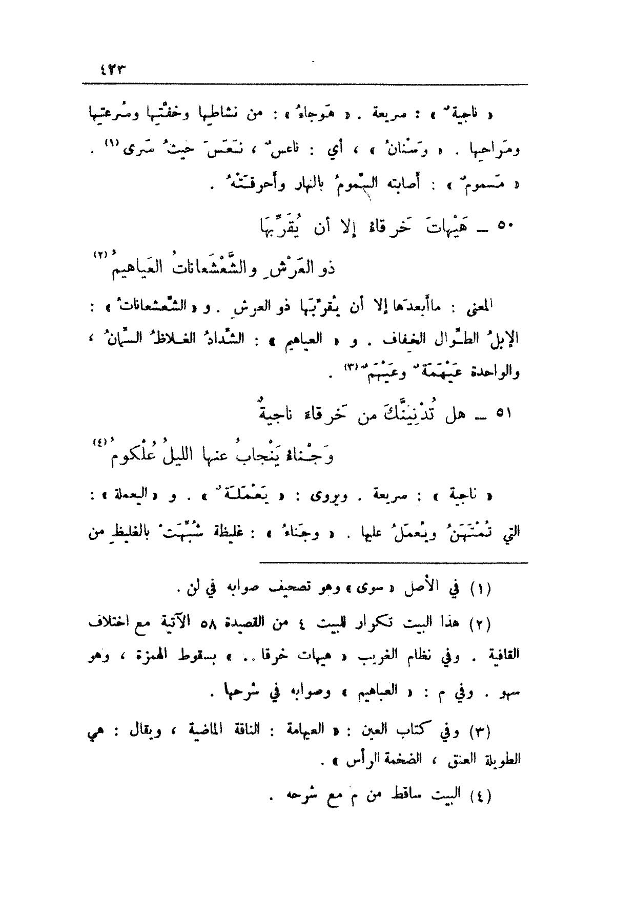 المعنى: ما أبعدها إلا أن يقربها ذو العرش. و"الشعشعانات": الإبل الطوال الخفاف. و"العياهيم": الشداد الغلاظ السمان، والواحدة عيهمةٌ وعيهمٌ.