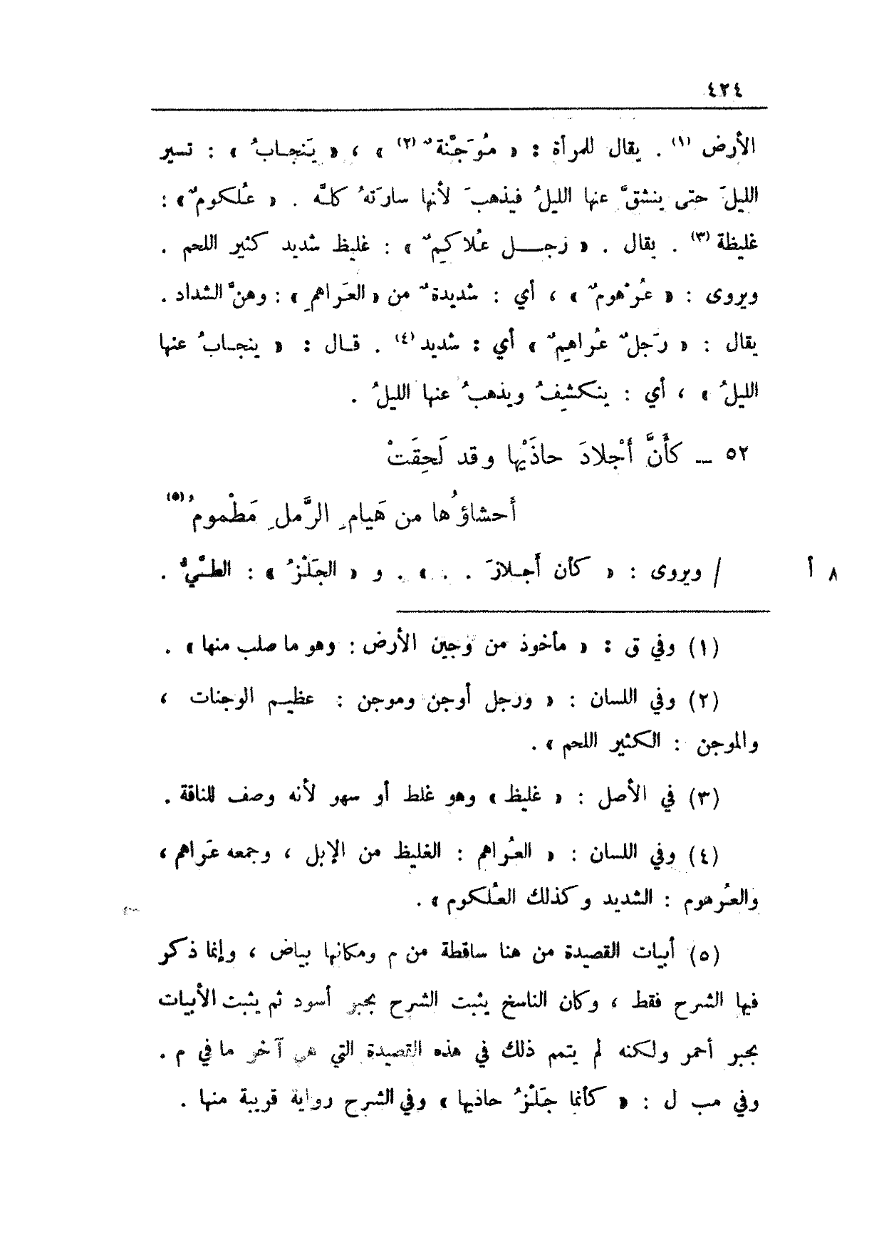 الأرض. يقال للمرأة: "موجنةٌ"، "ينجاب": تسير الليل حتى ينشق عنها الليل فيذهب لأنها سارته كله. "علكومٌ": غليظة. يقال: "رجل علاكمٌ": غليظ شديد كثير اللحم. ويروى: "عرهومٌ"، أي: شديدةٌ من "العراهم": وهن الشداد. يقال: "رجلٌ عراهمٌ" أي: شديد. قال: "ينجاب عنها الليل"، أي: ينكشف ويذهب عنها الليل.
