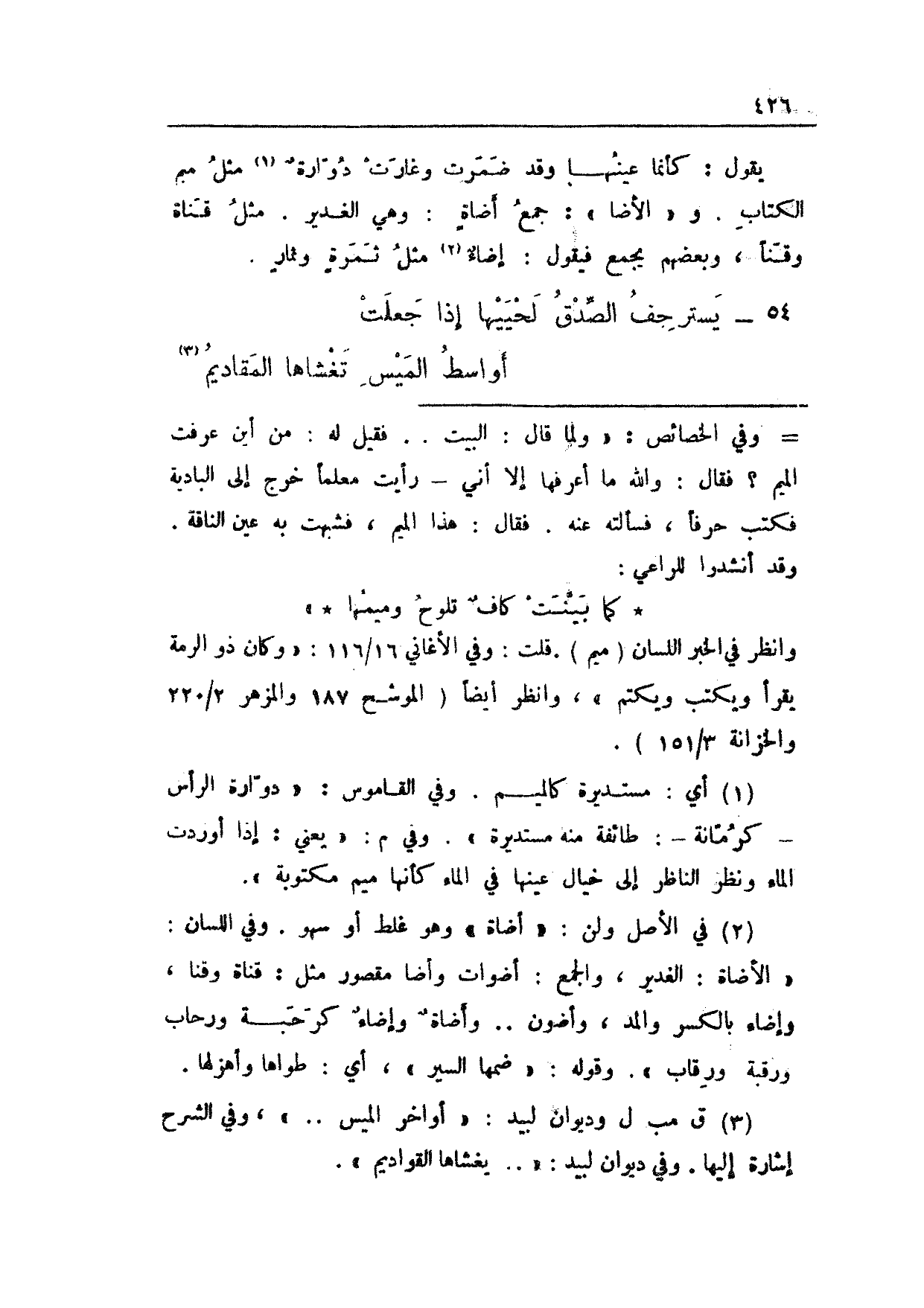 يقول: كأنما عينها وقد ضمرت وغارت دوارةٌ مثل مم الكتاب. و"الأضا": جمعُ أضاةٍ: وهي الغدير. مثل قناة وقنأ، وبعضهم يجمع فيقول: إضاءٌ مثل ثمرةٍ وثمارٍ.