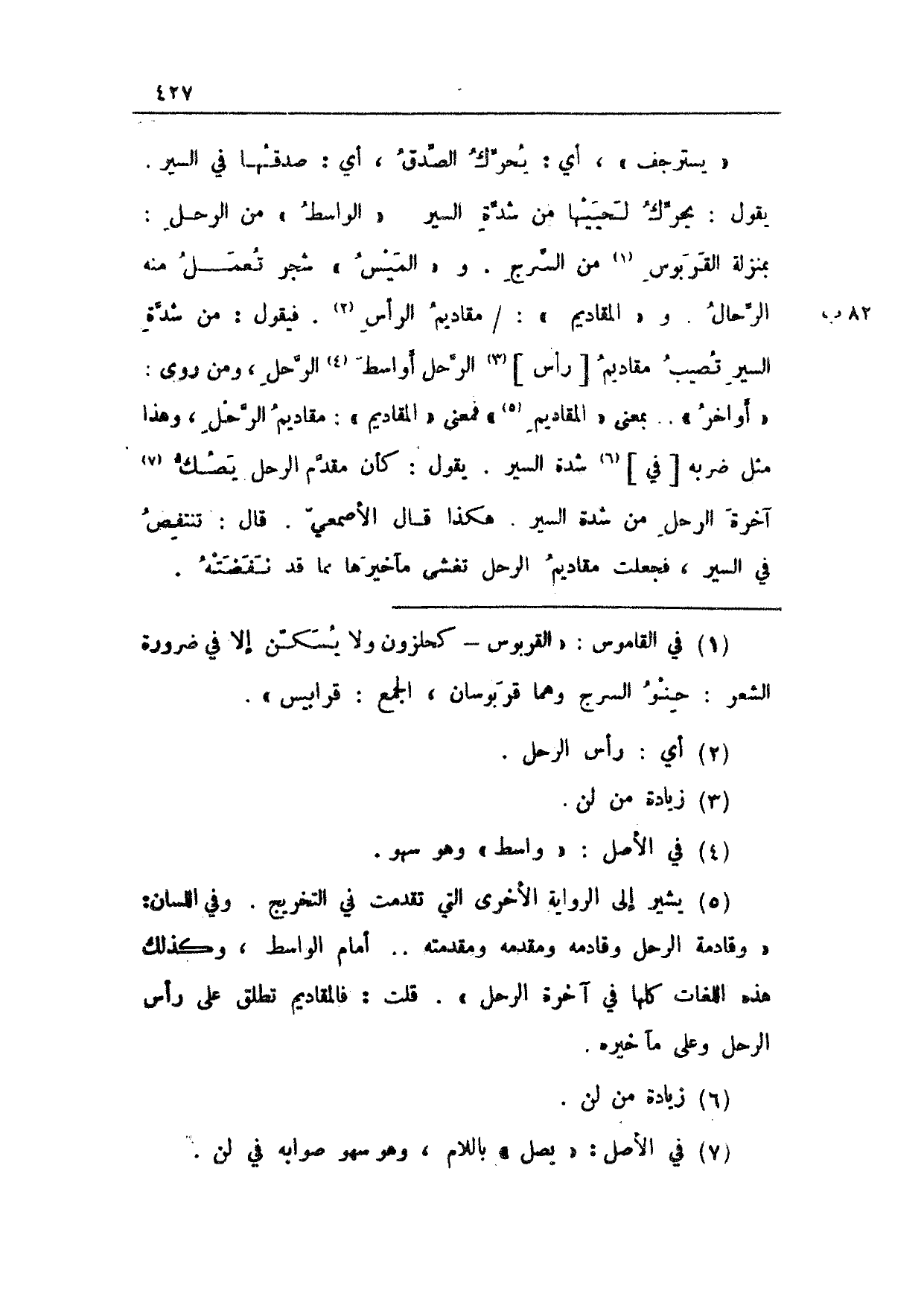 "يسترجف"، أي: يحرك الصدق، أي: صدقها في السير. يقول: يحرك لحييها من شدة السير. "الواسط" من الرحل: بمنزلة القربوس من السرج. و"الميس" شجر تعمل منه الرحال. و"المقاديم": 82 ب/ مقاديم الرأس. فيقول: من شدة السير تصيب مقاديم [رأس] الرحل أواسط الرحل، ومن روى: "اواخر". بمعنى "المقاديم" فمعنى "المقاديم": مقاديم الرحل، وهذا مثل ضربه [في] شدة السير. يقول: كأن مقدم الرحل يصك آخرة الرحل من شدة السير. هكذا قال الأصمعي. قال: تنتفض في السير، فجعلت مقاديم الرحل تغشى مآخيرها مما قد نفضته.