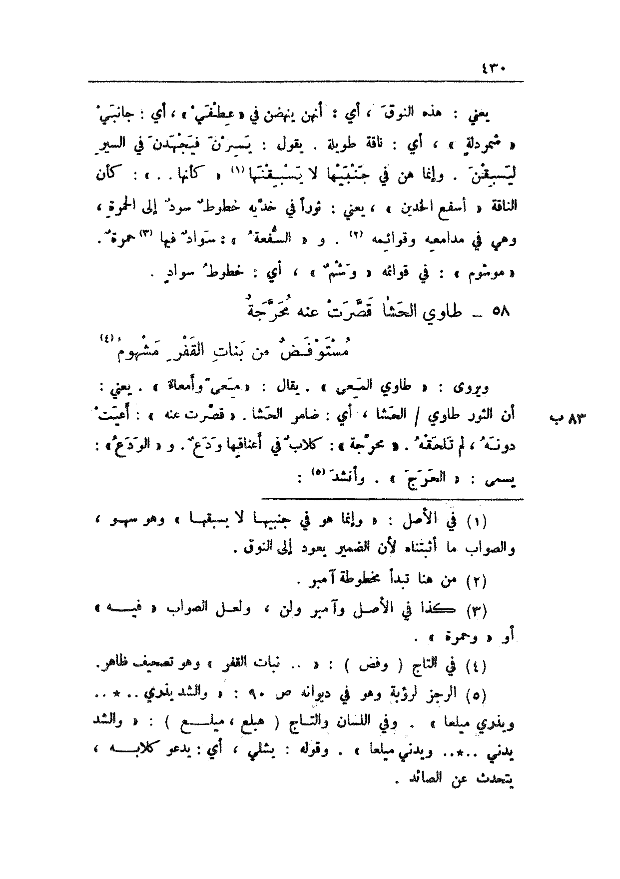 ويروى: "طاوي المعى". يقال: "معىً وأمعاءٌ". يعني: أن الثور طاوي 83 ب/ الحشا، أي: ضامر الحشا. "قصرت عنه": أعيت دونه، لم تلحقه. "محرجة": كلابٌ في أعناقها ودعٌ. و"الودع": يسمى: "الحرج". وأنشد: