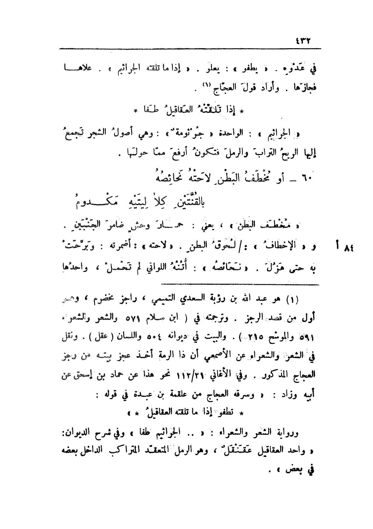 في عدوه. "يطفو": يعلو. "إذا ما تلقته الجراثيم". علاها فجازها. وأراد قول العجاج.