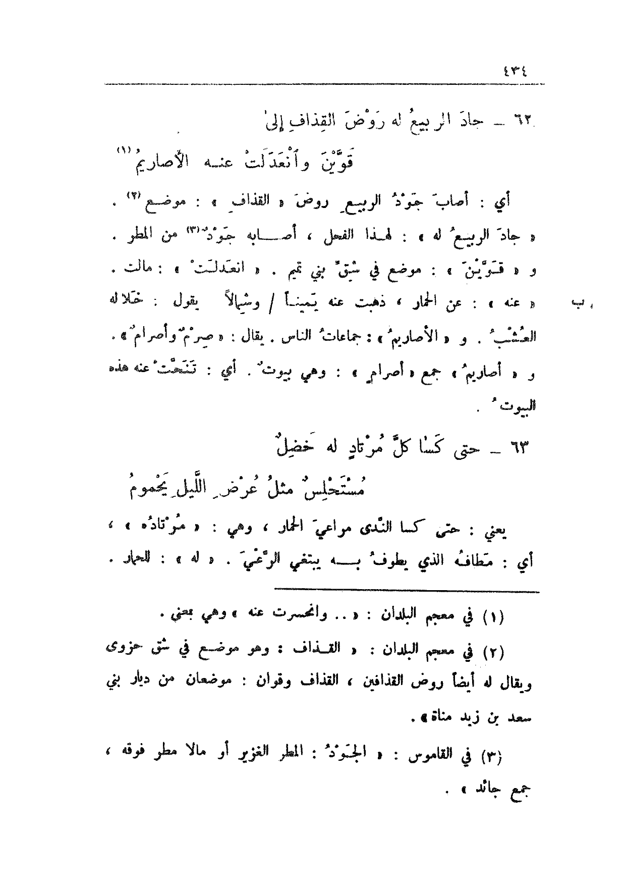 أي: أصاب جود الربعي روض "القذاف": موضع. "جاد الربيع له": لهذا الفحل، أصابه جودٌ من المطر. و"قوين": موضع في شق بني تميم. "انعدلت": مالت. "عنه": عن الحمار، ذهبت عنه يميناً 84 ب/ وشمالاً. يقول: خلاله العشب. و"الأصاريم": جماعات الناس. يقال: "صرمٌ وأصرامٌ". و"أصاريمُ" جمع أصرامٍ": وهي بيوتٌ. أي: تنحت عنه هذه البيوت.