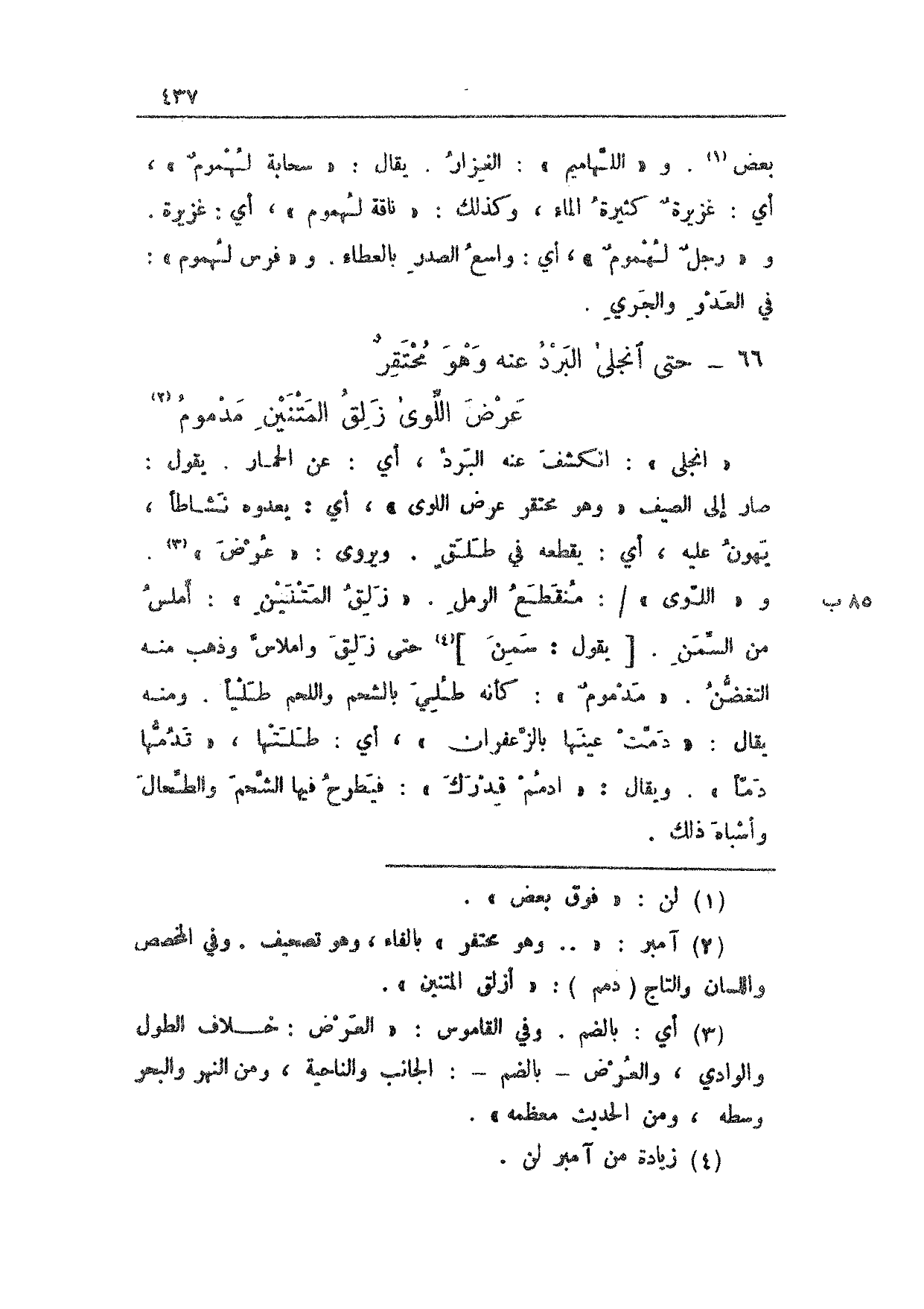 "انجلى": انكشف عنه البرد، أي: عن الحمار. يقول: صار إلى الصيف "وهو محتقر عرض اللوى"، أي: يعدوه نشاطاً، يهون عليه، أي: يقطعه في طلقٍ. ويروى: "عرض". و"اللوى" 85 ب/: منقطع الرمل. "زلق المتنين": أملس من السمن. [يقول: سمن] حتى زلق وأملاس وذهب منه التغضن. "مدمومٌ": كأنه طُلي بالشحم واللحم طلياً. ومنه يقال: "دمت عينها بالزعفران"، أي: طلتها، "تدمها دماً". ويقال: "ادمم قدرك": فيطرح فيها الشحم والطحال وأشباه ذلك.