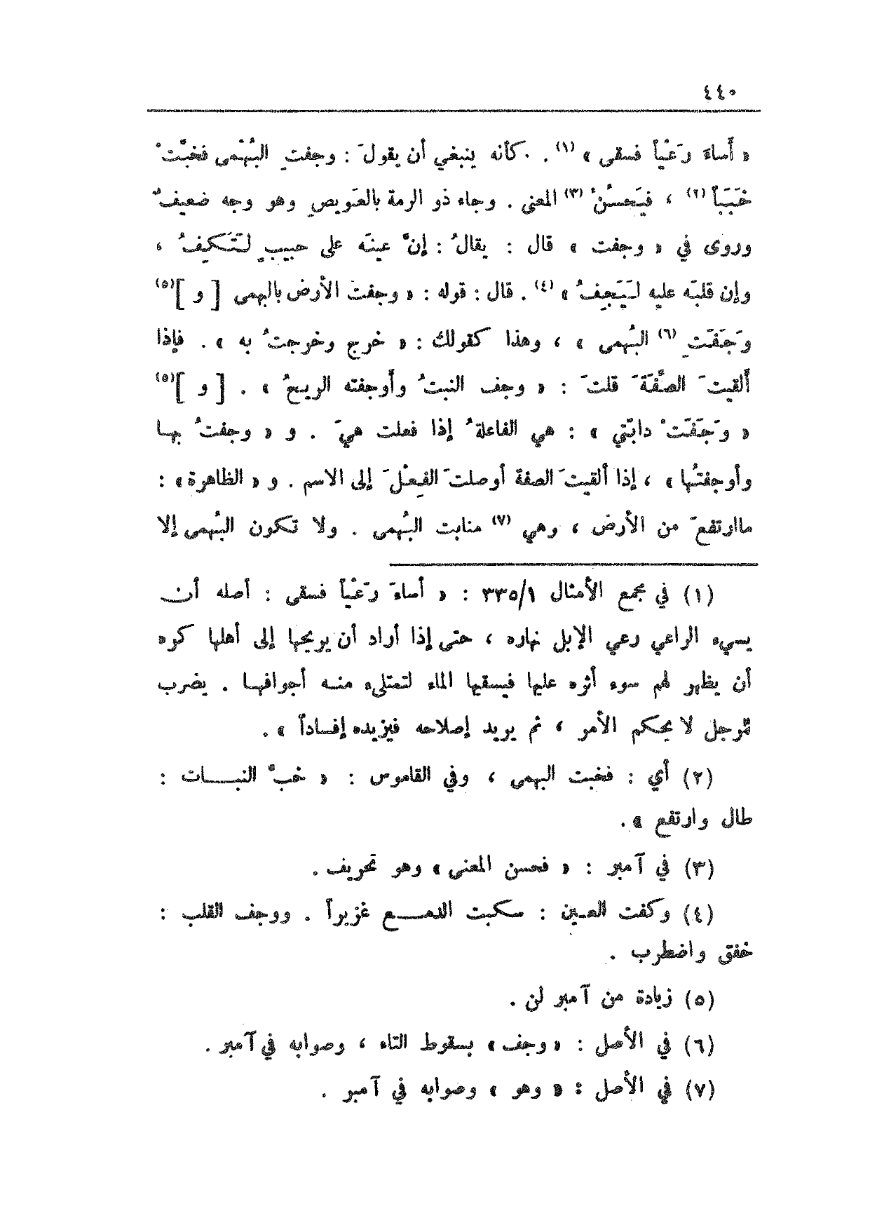 "أساء رعياً فسقى". كأنه ينبغي أن يقول: وجفت البهمى فخبت خبباً، فيحسن المعنى. وجاء ذو الرمة بالعويص وهو وجه ضعيفٌ وروى في "وجفت" قال: يقال: إن عينه على حبيبٍ لتكف، وإن قلبه عليه ليجف". قال: قوله: "وجفت الأرض بالبهمى [و] "وجفت دابتي": هي الفاعلة إذا فعلت هي. و"وجفت بها وأوجفتها"، إذا ألقيت الصفة أوصلت الفعل إلى الاسم. و"الظاهرة": ما ارتفع من الأرض، وهي منابت البهمى. ولا تكون البهمى إلا