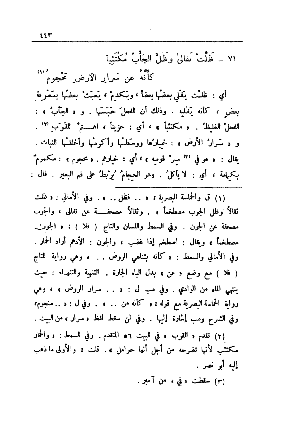 أي: ظلت يفلي بعضها بعضاً، ويكدم، يعبث بعضها بمعرفة بعضٍ، كأنه يفليه. وذلك أن الفحل حبسها. و"الجأب": الفحل الغليظ. "مكتئباً"، أي: حزيناً، اهتم للقرب. و"سرار الأرض": خيارها ووسطها وأكرمها وأخلقها للنبات. يقال: "هو في سر قومه"، أي: خيارهم. "محجوم": مكمومق بكمامة، أي: لا يأكل. وهو الحجامُ يربط على فم البعير. قال: