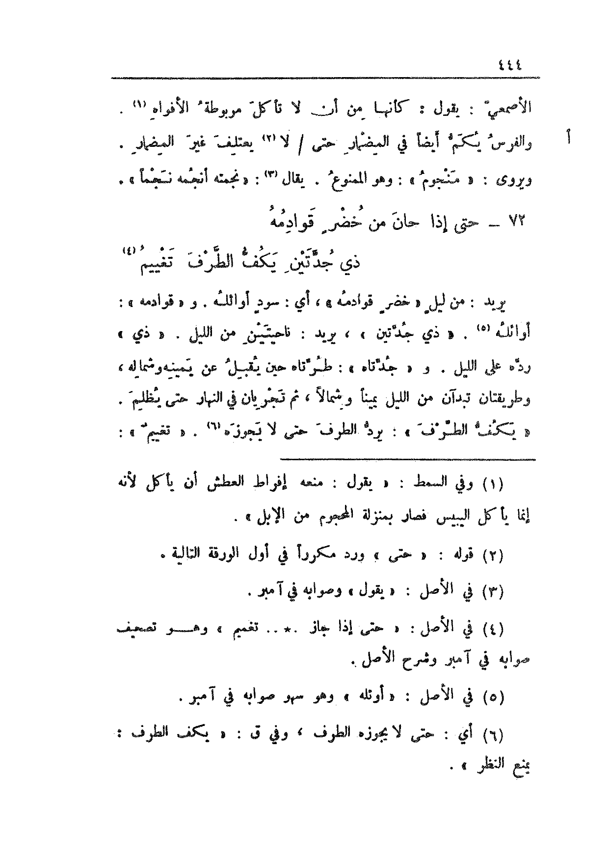 الأصمعي: يقول: كأنها من أن لا تأكل مربوطة الأفواه. والفرس يكم أيضاً في المضمار حتى 87 أ/ لا يعتلف غير المضمار. ويروى: "منجوم": وهو الممنوع. يقال: "نجمته أنجمه نجماً".