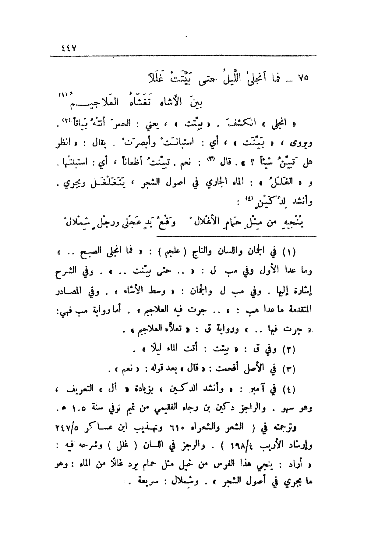 75 - فما انجلى الليل حتى بيتت غللاً ... بين الأشاء تغشاه العلاجيم