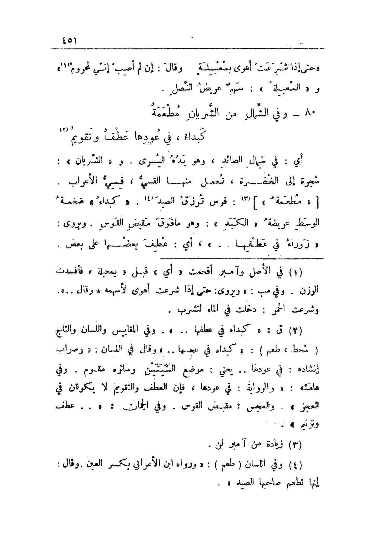 أي: في شمال الصائد، وهو يده اليسرى. و"الشريان": شجرة إلى الخضرة، تعمل منها القسي، قسي الأعراب. ["مطعمةٌ"]: قوس ترزق الصيد. "كبداء" ضخمة الوسط عريضة "الكبد": وهو ما فوق مقبض القوس. ويروى: "زوراء في عطفها .. "، أي: عطف بعضها على بعض.