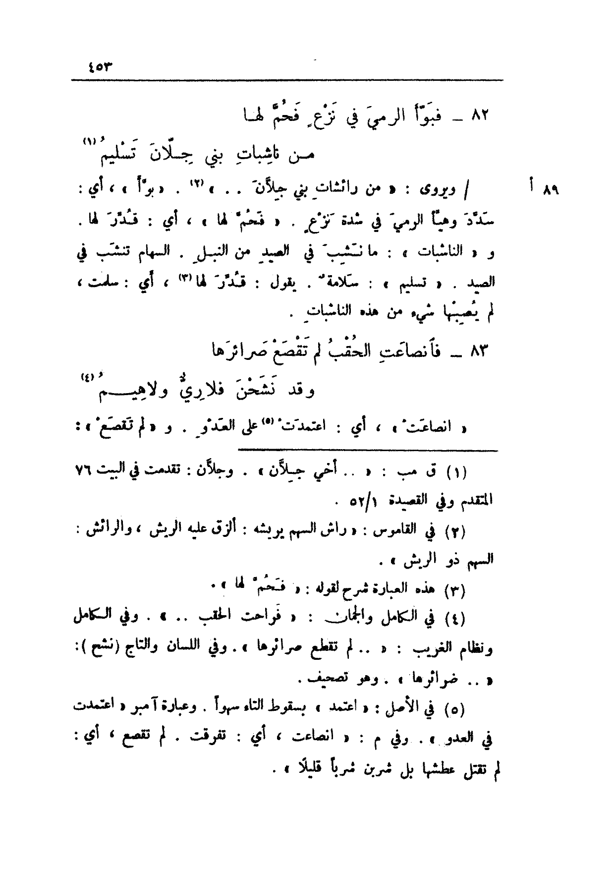 89 أ/ ويروى: "من رائشات بني جلان .. ". "بوأ"، أي: سدد وهيأ الرمي في شدة نزعٍ. "فحم لها"، أي: قدر لها. و"الناشبات": ما نشب في الصيد من النبل. السهام تنشب في الصيد. "تسليم": سلامةٌ. يقول: قدر لها، أي: سلمت، لم يصبها شيء من هذه الناشبات.