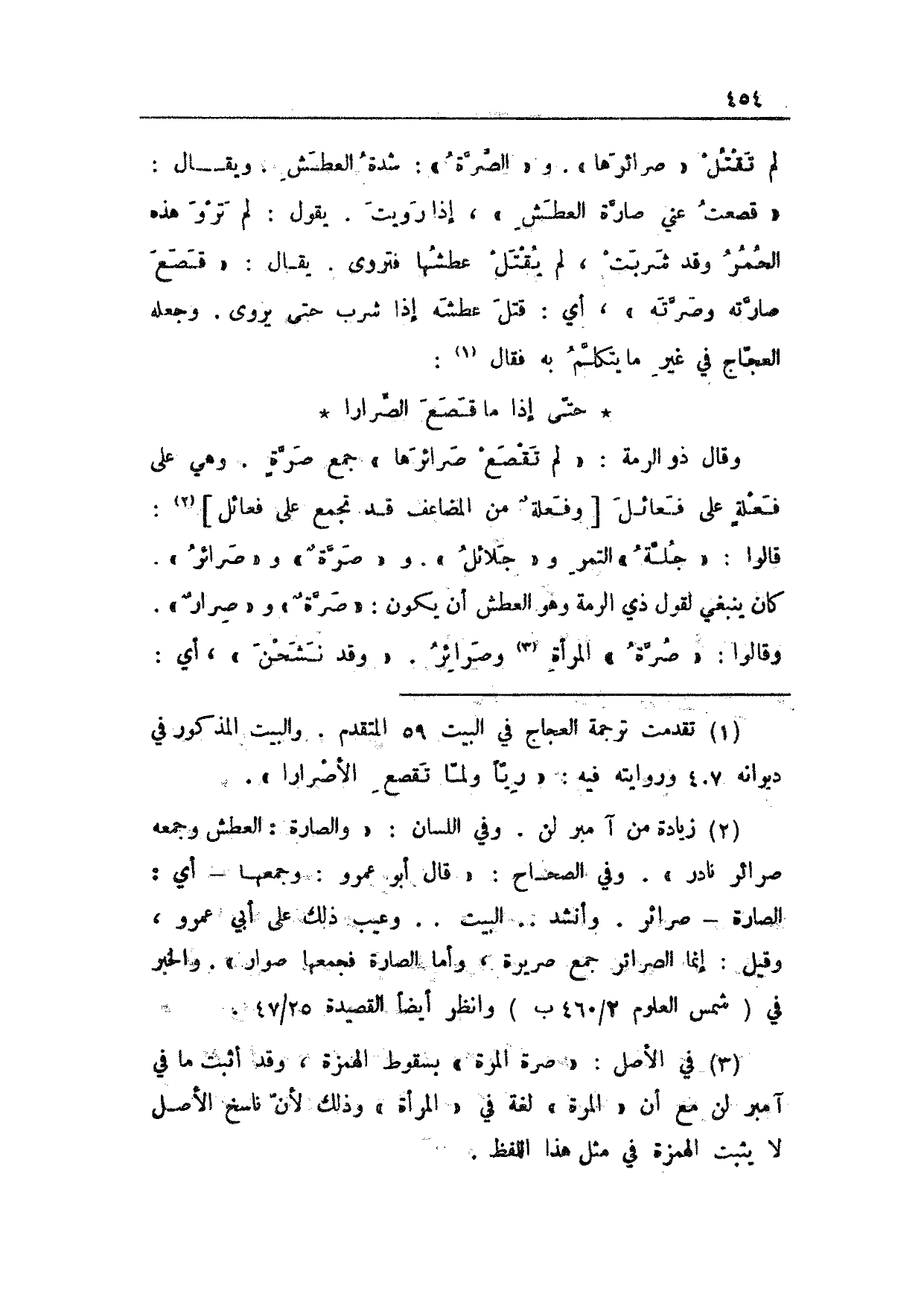 وقال ذو الرمة: "لم تقصع صرائرها" جمع صرةٍ. وهي على فعلةٍ على فعائل [وفعلةٌ من المضاعف قد تجمع على فعائل]: قالوا: "جلة" التمر و"جلائل". و"صرةٌ" و"صرائر". كان ينبغي لقول ذي الرمة وهو العطش أن يكون: "صرةٌ" و"صرارٌ". وقالوا: "صرة" المرأة وصرائر. "وقد نشحن"، أي: