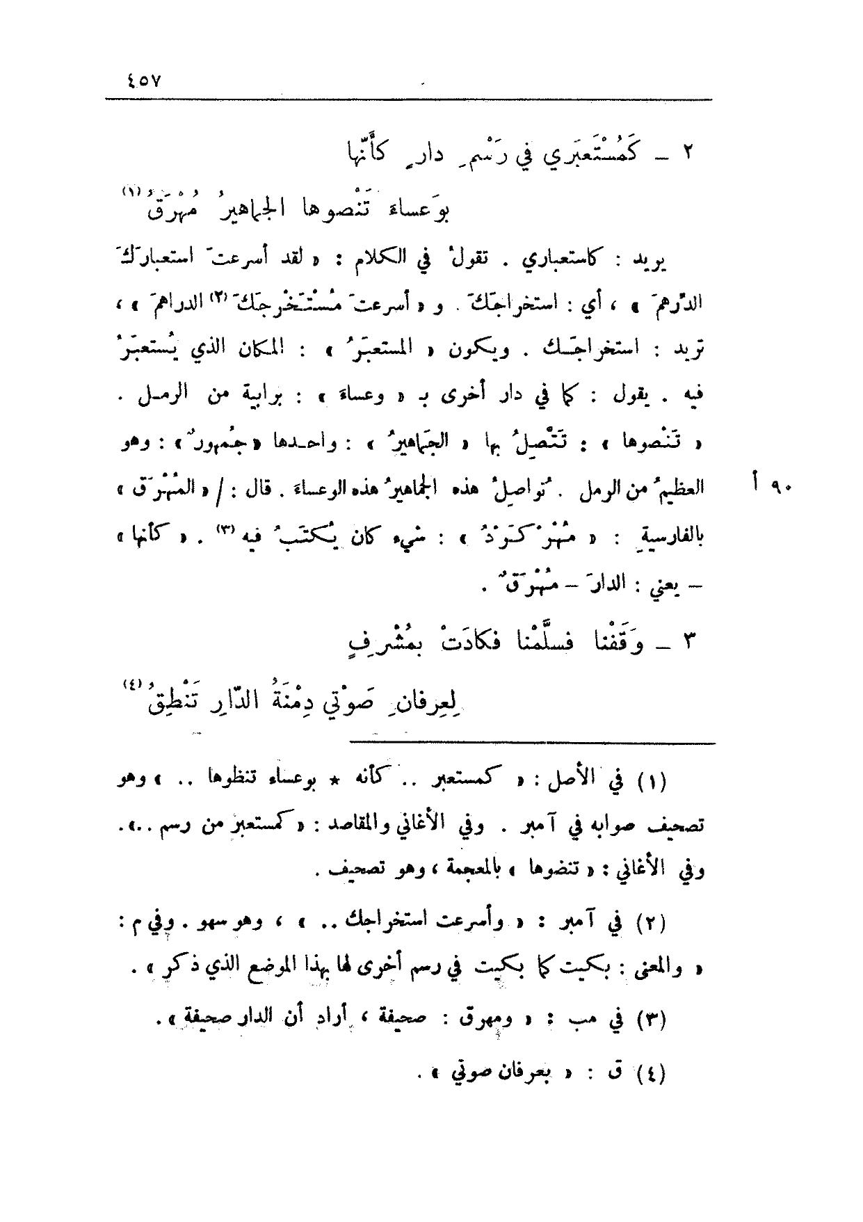 يريد: كاستعباري. تقول في الكلام: "لقد أسرعت استعبارك الدرهم"، أي: استخراجك. و"أسرعت مستخرجك الدراهم"، تريد: استخراجك. ويكون "المستعبر": المكان الذي يستعبر فيه. يقول: كما في دار أخرى بـ"وعساء": برابية من الرمل. "تنصوها": تتصل بها "الجماهير": واحدها "جمهورٌ": وهو العظيم من الرمل. تواصل هذه الجماهير هذه الوعساء. قال: 90 أ/ "المهرق" بالفارسية: "مهر كرد": شيء كان يكتب فيه. "كأنها" - يعني: الدار - مهرقٌ.