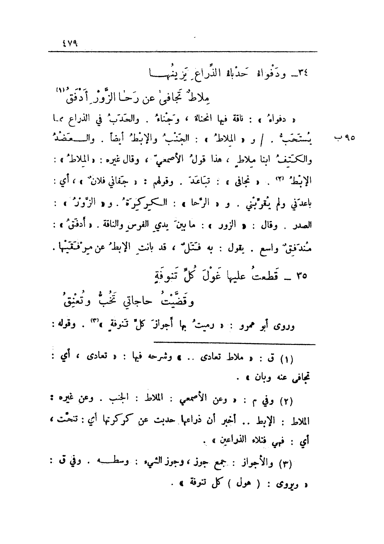 "دفواء": ناقة فيها انحناءٌ، وجناء. والحدب في الذراع مما يستحب. 95 ب/ و"الملاط": الجنب والإبط أيضاً. والعضد والكتف ابنا ملاطٍ، هذا قول الأصمعي، وقال غيره: "الملاط": الإبط. "تجافي": تباعد. وقولهم: "جفاني فلانٌ"، أي: باعدني ولم يقربني. و"الرحا": الكركرة. و"الزور": الصدر. وقال: "الزور": ما بين يدي الفرس والناقة. "أدفق": مندفقٌ واسع. يقول: "به فتلٌ، قد بانت الإبط عن مرفقيها.