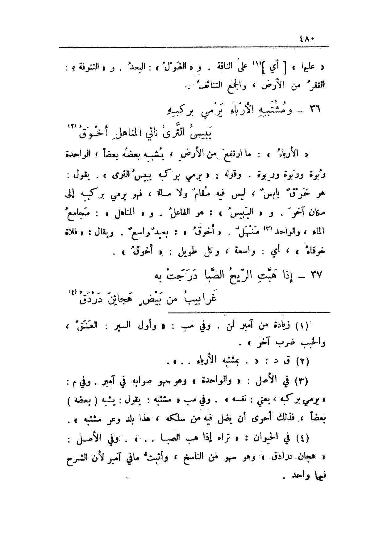 "الأرباء": ما ارتفع من الأرض، يشبه بعضه بعضاً، الواحدة رُبوة ورَبوة ورِبوة. وقوله: "يرمي بركبه يبيس الثرى". يقول: هو خرقٌ يابسٌ، ليس فيه مقامٌ ولا ماءٌ، فهو يرمي بركبه إلى مكان آخر. و"اليبيس": هو الفاعل. و"المناهل": مجامع الماء، والواحد منهلٌ. "أخوق": بعيدٌ واسعٌ. ويقال: "فلاة خوقاء"، أي: واسعة، وكل طويل: أخوق".