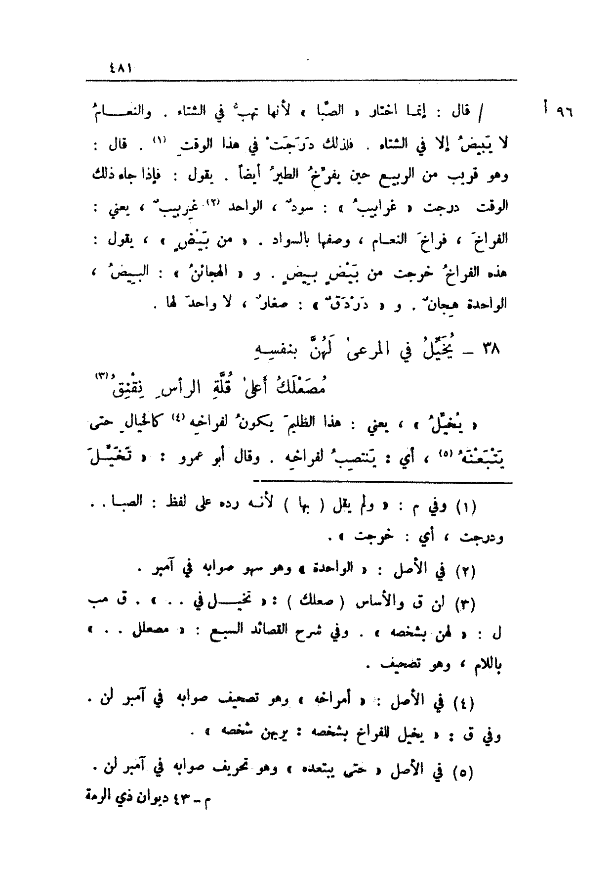 96 أ/ قال: إنما اختار "الصبا" لأ، ها تهب في الشتاء. والنعام لا يبيض إلا في الشتاء. فلذلك درجت في هذا الوقت. قال: وهو قريب من الربيع حين يفرخ الطير أيضاً. يقول: فإذا جاء ذلك الوقت درجت "غرابيب": سودٌ، الواحد غريبٌ، يعني: الفراخ، فراخ النعام، وصفها بالسواد. "من بيضٍ"، يقول: هذه الفراخ خرجت من بَيْضٍ بِيضٍ. و"الهجائن": البيضُ الواحدة هجانٌ. و"دردقٌ": صغارٌ، لا واحد لها.