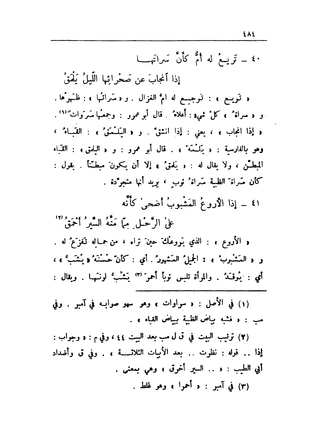 "تريع": ترجع له ام الغزال. و"سراتها": ظهرها. و"سراة" كل شيءٍ: أعلاه. قال أبو عمرو: وجمعها سرواتٌ. "إذا انجاب"، يعني: إذا انشق. و"اليلمق": القباء، وهو بالفارسية: "يلمه". قال أبو عمرو: و"اليلمق": القباء المبطن، ولا يقال له: "يلمق" إلا أن يكون مبطناً. يقول: كأن سراة الظبية سراة ثوبٍ، يريد أنها متجردة.