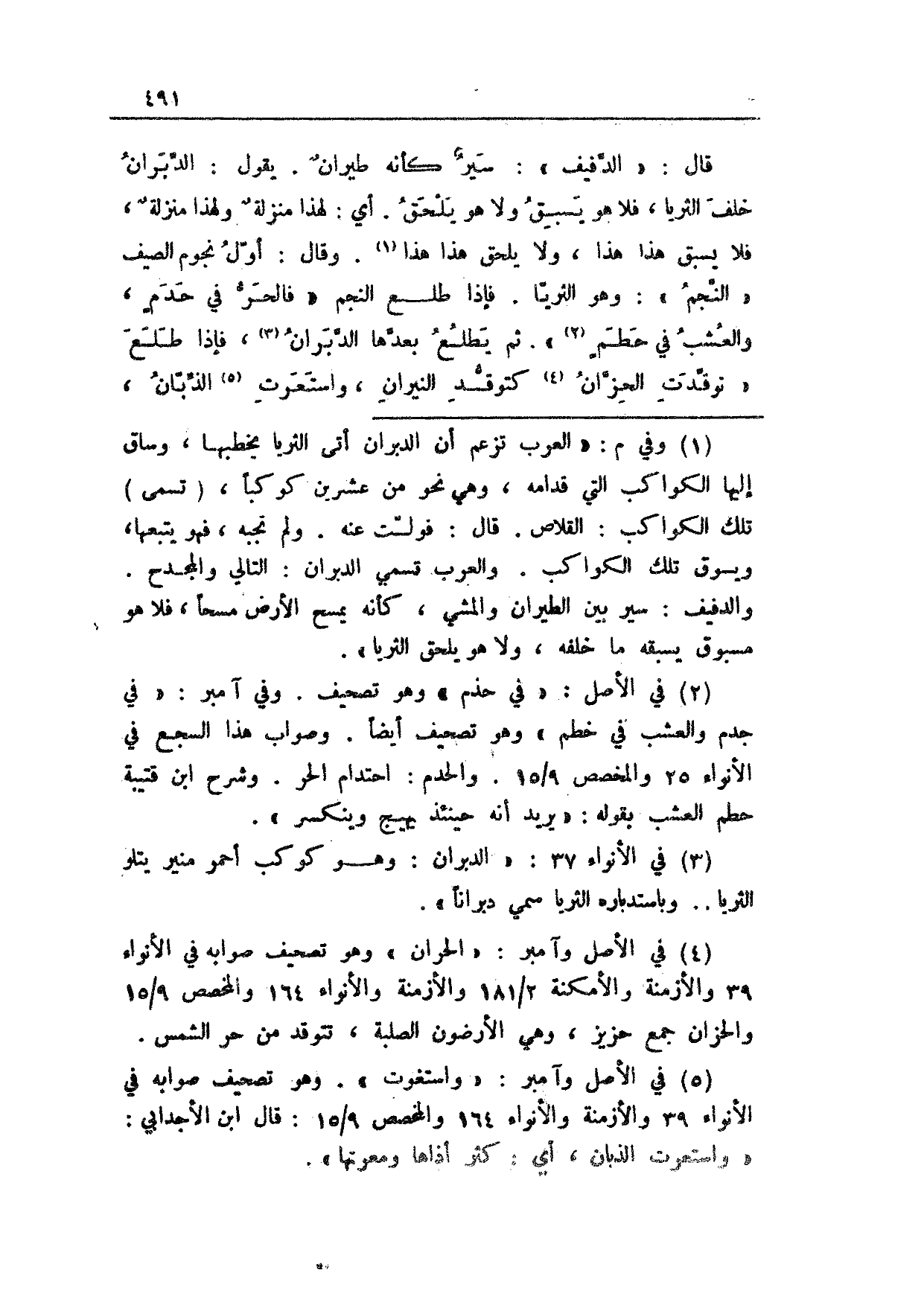 قال: "الدفيف": سيرٌ كأنه طيرانٌ. يقول: الدبران خلف الثريا، فلا هو يسبق ولا هو يلحق. أي: لهذا منزلةٌ ولهذا منزلةٌ، فلا يسبق هذا هذا، ولا يلحق هذا هذا. وقال: أول نجوم الصيف "النجم": وهو الثريا. فإذا طلع النجم "فالحر في حدمٍ، والعشب في حطمٍ". ثم يطلع بعدها الدبران، فإذا طلع "توقدت الحزان كتوقد النيران، واستعرت الذبان،
