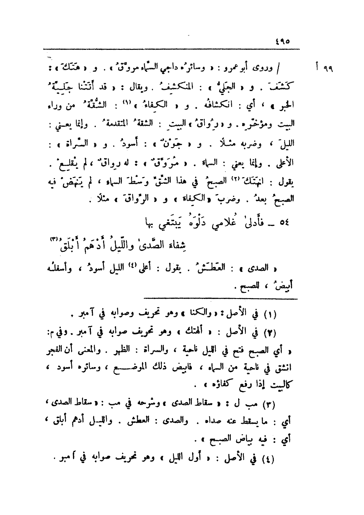 "الصدى": العطش. يقول: أعلى الليل أسود، وأسفله أبيض، للصبح.