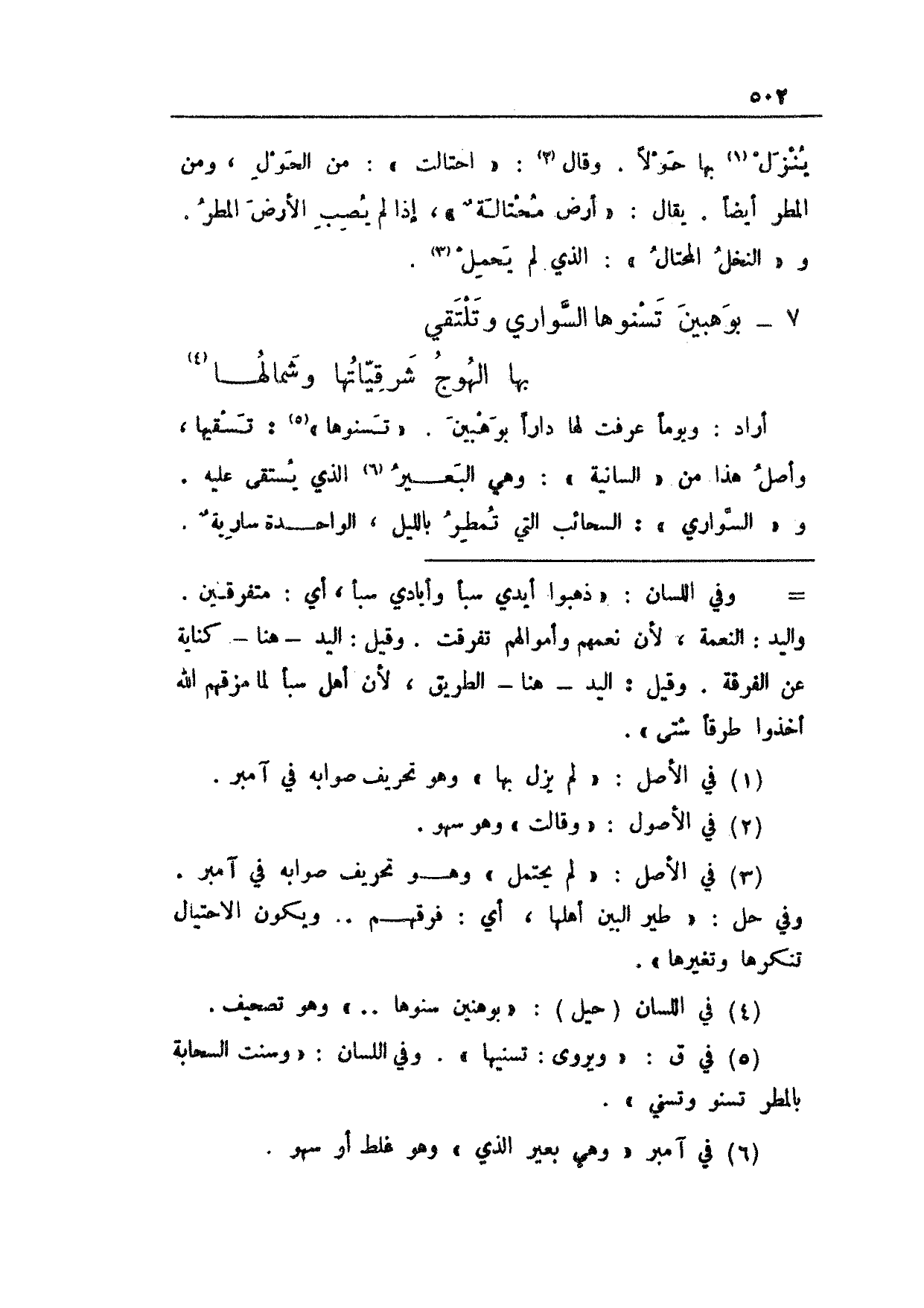 أراد: ويوماً عرفت لها داراً بوهبين. "تسنوها": تسقيها، وأصل هذا من "السانية": وهي البعير الذي يستقى عليه. و"السواري": السحائب التي تمطر بالليل، الواحدة ساريةٌ.