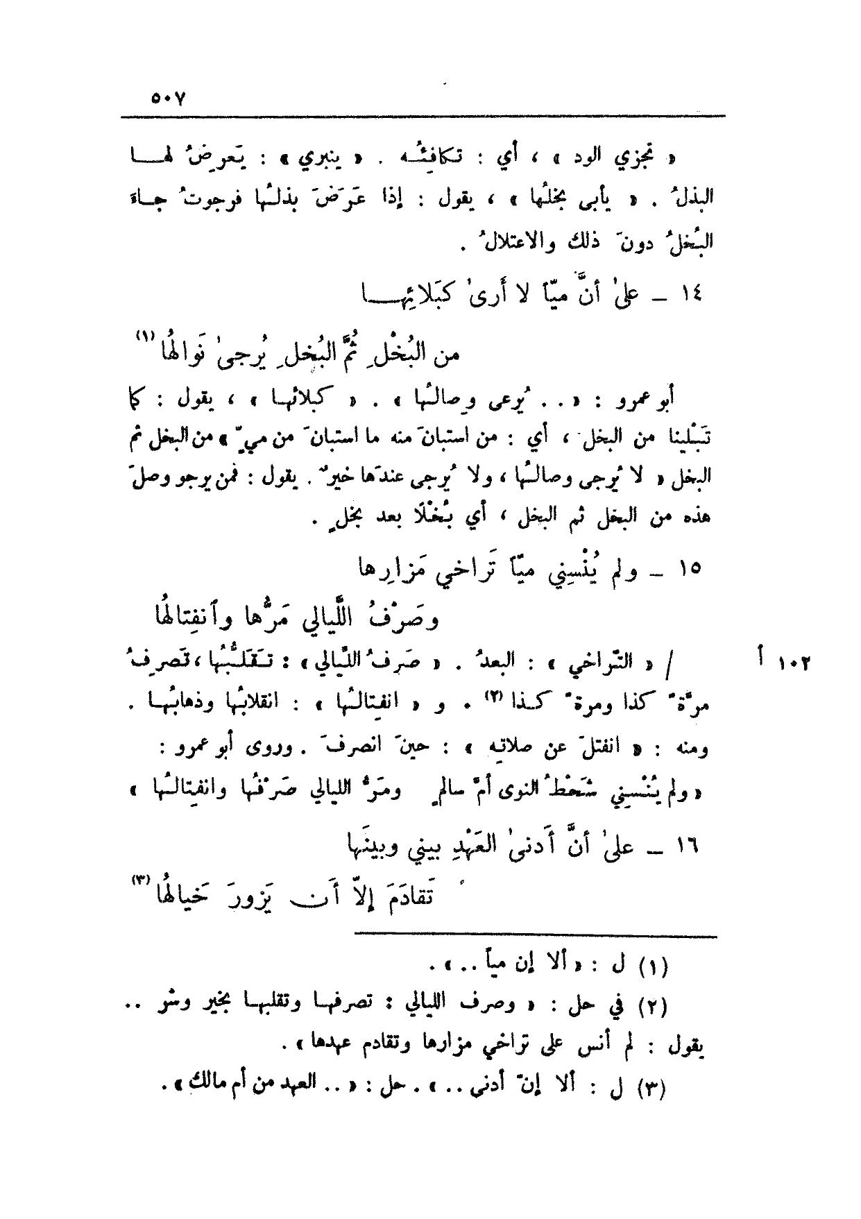 102 أ/ "التراخي": البعد. "صرف الليالي": تقلبها، تصرف مرةً كذا ومرةً كذا. و"انفتالها": انقلابها وذهابها. ومنه: "انفتل عن صلاته": حين انصرف. وروى أبو عمرو: