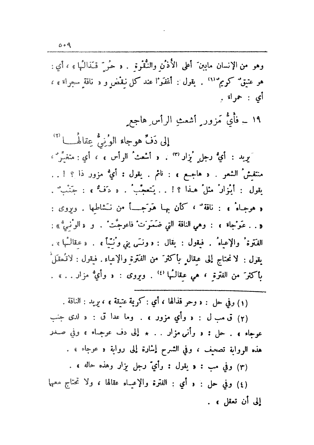 يريد: أي رجلٍ يزار. "أشعث الرأس"، أي: متغيرٌ، منتفش الشعر. "هاجع": نائم. يقول: أي مزور ذا؟! .. يقول: أيزار مثل هذا؟! .. يتعجب. "دفٌ": جنبٌ. "هوجاء": ناقةٌ، كأن بها هوجاً من نشاطها. ويروى: " .. عوجاء": وهي الناقة التي ضمرت فاعوجت. و"الوني": الفترة والإعياء. فيقول: يقال: "ونى يني ونياً". "عقالها". يقول: لا تحتاج إلى عقالٍ بأكثر من الفترة والإعياء. فيقول: لا تعقل بأكثر من الفترة، هي عقالها. ويروى: "وأيُّ مزار .. ".