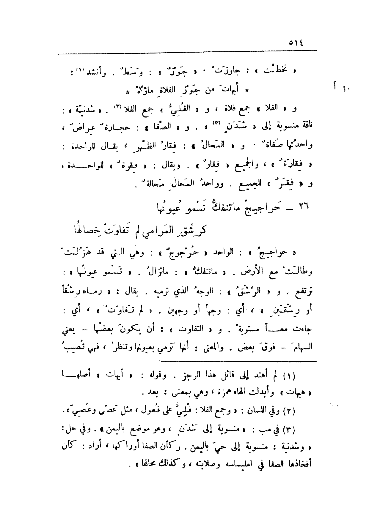 و"الفلا" جمع فلاة، و"الفُلي" جمع الفلا. "شدنية": ناقة منسوبة إلى "شدنٍ". و"الصفا": حجارةٌ عراضٌ، واحدتها صفاةٌ. و"المحال": فقار الظهر، يقال للواحدة: "فقارةٌ"، والجميع "فقارٌ". ويقال: "فِقرةٌ" للواحدة، و"فِقَرٌ" للجميع. وواحد المحال محالةٌ.