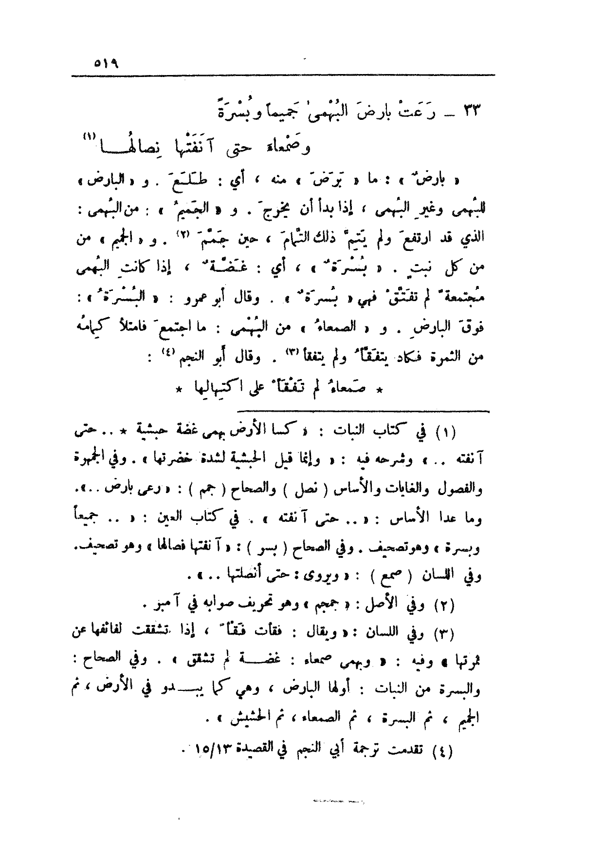 "بارضٌ": ما "برض" منه، أي: طلع. و"البارض" للبهمى وغير البهمى، إذا بدأ أن يخرج. و"الجميم": من البهمى: الذي قد ارتفع ولم يتم ذلك التمام، حين جمم. و"الجميم" من كل نبتٍ. "بُسرةٌ"، أي: غضةٌ، إذا كانت البهمى مجتمعةً لم تفتق فهي "بسرةٌ". وقال أبو عمرو: "البسرةُ": فوق البارض. و"الصمعاء" من البهمى: ما اجتمع فامتلأ كمامه من الثمرة فكاد يتفقأ ولم يتفقأ. وقال أبو النجم: