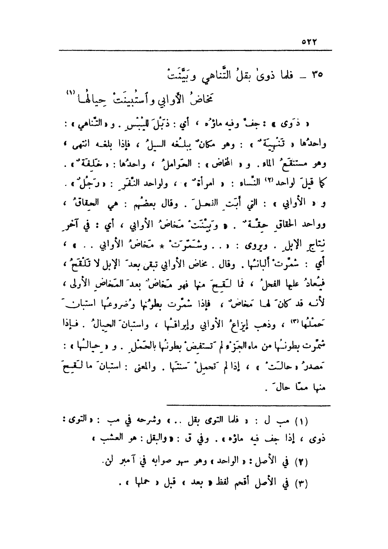 "ذوى": جف وفيه ماؤه، أي: ذبل لليبس. و"التناهي": واحدها "تنهيةٌ": وهو مكانٌ يبلغه السيل، فإذا بلغه انتهى، وهو مستنقع الماء. و"المخاض": الحوامل، واحدها: "خلفةٌ". كما قيل لواحد النساء: "امرأةٌ"، ولواحد النفر: "رجلق". و"الأوابي": التي أبت الفحل. وقال بعضهم: هي الحقاق، وواحد الحقاق حقةٌ. و"بينت مخاض الأوابي، أي: في آخر نتاج الإبل. ويروى: " .. وشمرت* مخاض الأوابي .. "، أي: شمرت ألبانها. وقال. مخاض الأوابي تبقى بعد الإبل لا تلقح، فيعاد عليها الفحل، فما لقح منها فهو مخاضٌ بعد المخاض الأولى، لأنه قد كان لها مخاضٌ، فإذا شمرت بطونها وضروعها استبان حملها، وذهب إيزاع الأوابي وإبراقها، واستبان الحيال. فإذا شمرت بطونها من ماء الجزءلم تستفض بطونها بالحمل. و"حيالها": مصدر "حالت"، إذا لم تحمل سنتها. والمعنى: استبان ما لقح منها مما حال.