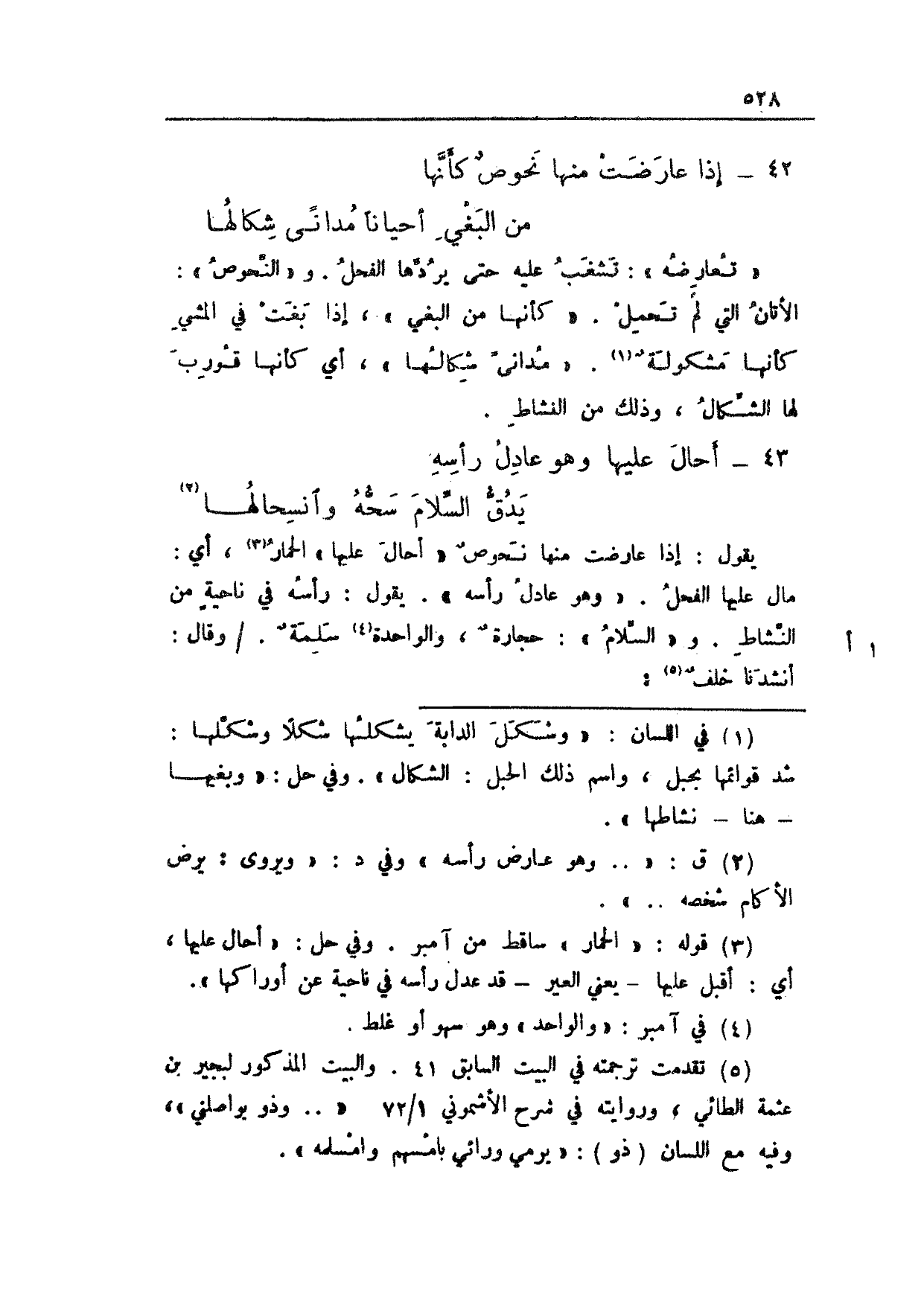 "تعارضه": تشغب عليه حتى يردها الفحل. و"النحوص": الأتان التي لم تحمل. "كأنها من البغي"، إذا بغت في المشي كأنها مشكولةٌ. "مدانىً شكالها"، أي كأنها قورب لها الشكال، وذلك من النشاط.