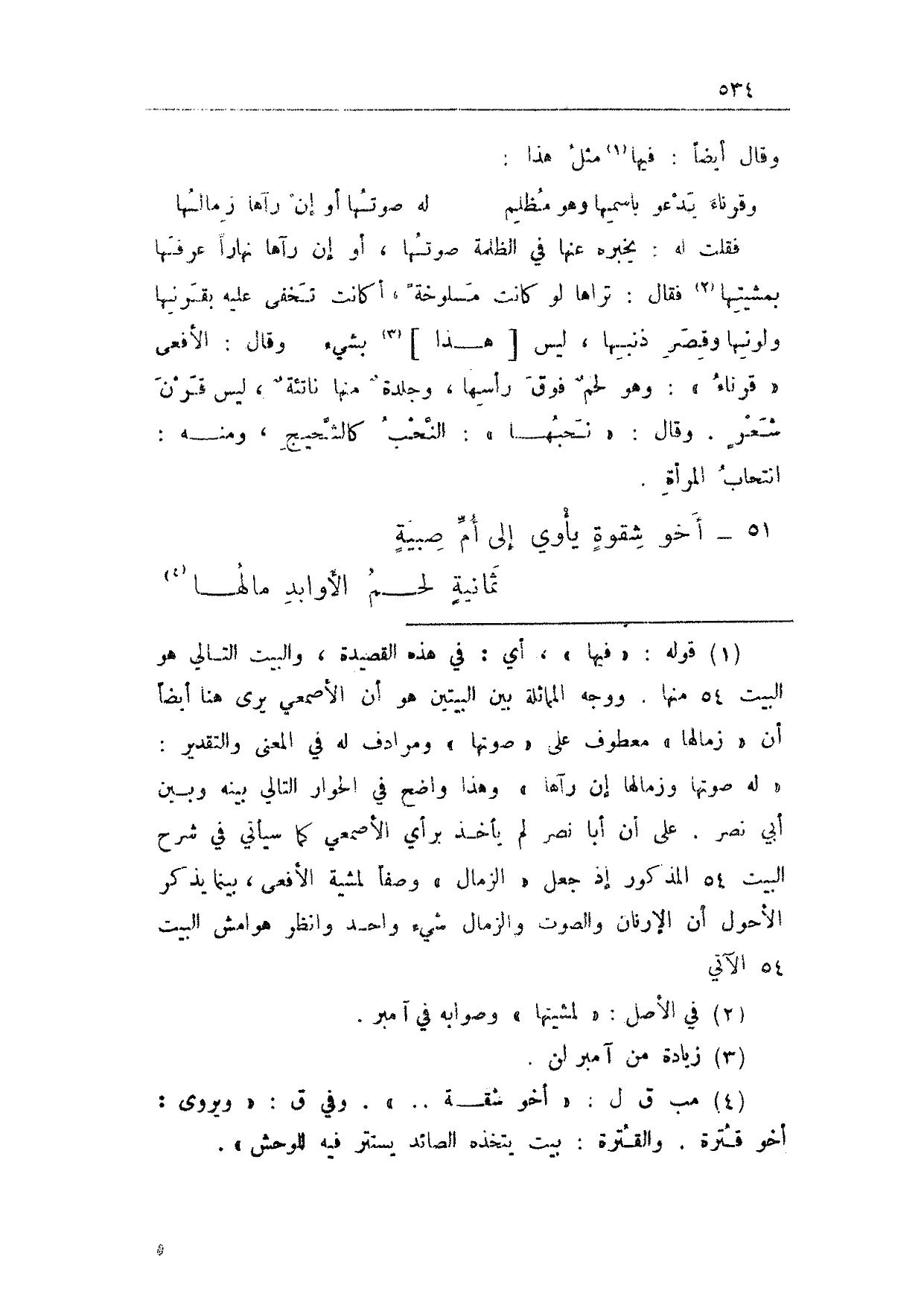 فقلت له: يخبره عنها في الظلمة صوتها، أو إن رآها نهاراً عرفها بمشيتها فقال: تراها لو كانت مسلوخة، أكانت تخفى عليه بقرنها ولونها وقصر ذنبها، ليس [هذا] بشيء وقال: الأفعى "قرناء": وهو لحمٌ فوق رأسها، وجلدةٌ منها ناتئةٌ، ليس قرن شعرٍ. وقال: "نحبها": النحب كالشحيج، ومنه: انتحاب المرأة.