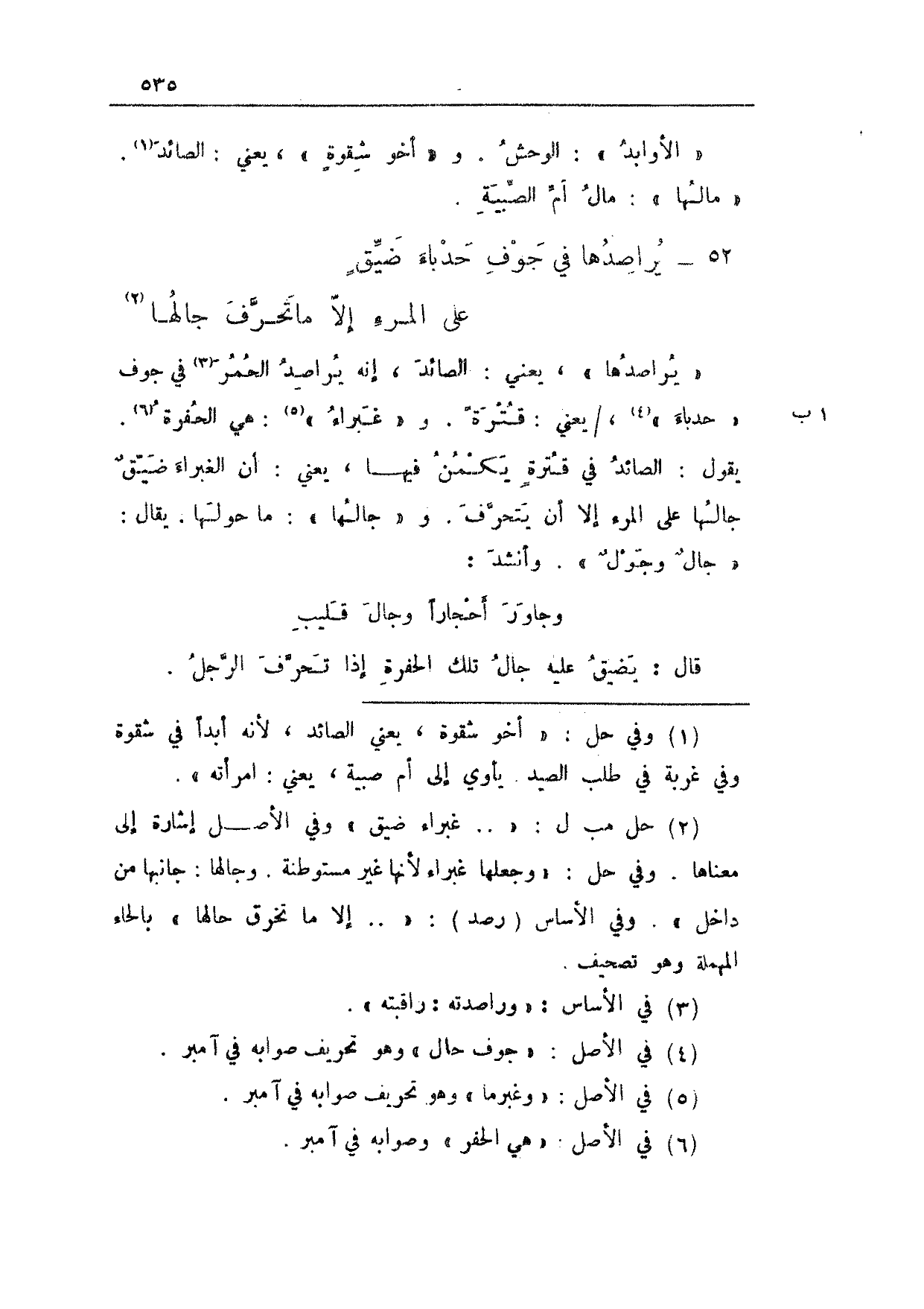"يراصدها"، يعني: الصائد، إنه يراصد الحمر في جوف "حدباء"، 1 ب/ يعني: قترةً. و"غبراء": هي الحفرة. يقول: الصائد في قترةٍ يكمن فيها، يعني: أن الغبراء ضيقٌ جالها على المرء إلا أن يتحرف. و"جالها": ما حولها. يقال: "جالٌ وجولٌ". وأنشد: