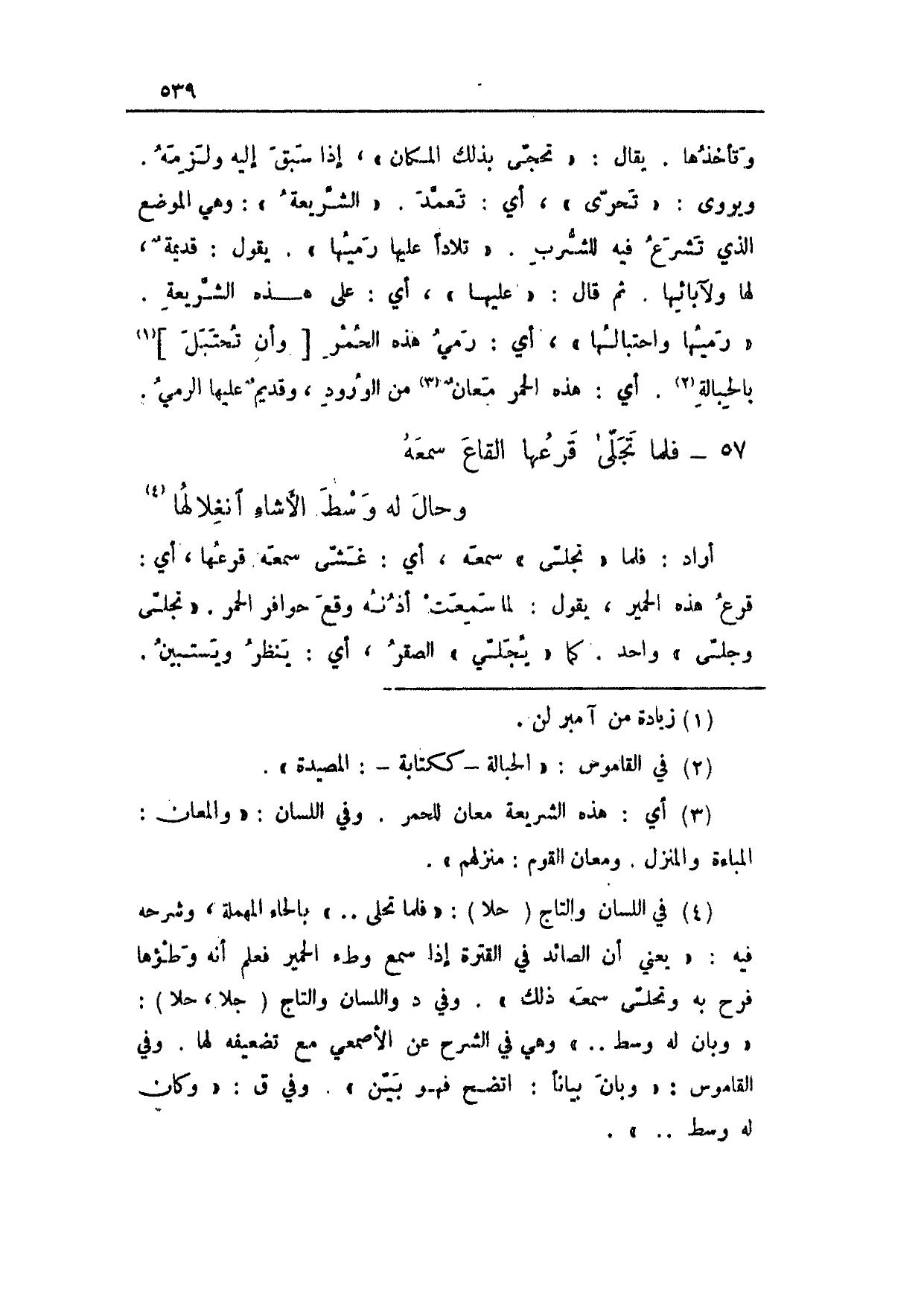وتأخذها. يقال: "تحجى بذلك المكان"، إذا سبق إليه ولزمه. ويروى: "تحرى"، أي: تعمد. "الشريعة": وهي الموضع الذي تشرع فيه للشرب. "تلاداً عليها رميها". يقول: قديمةٌ، لها ولآبائها. ثم قال: "عليها"، أي: على هذه الشريعة. "رميها واحتبالها"، أي: رمي هذه الحمر [وأن تحتبل] بالحبالة. أي: هذه الحمر معانٌ من الورود، وقديمٌ عليها الرمي.
