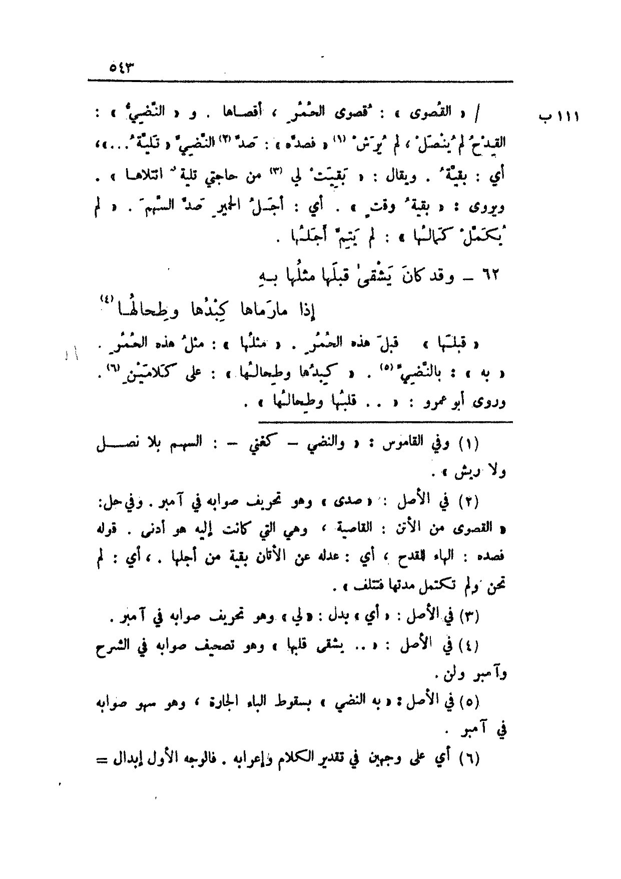 111 ب/ "القصوى": قصوى الحمر، أقصاها. و"النضي": القدح لم ينصل، لم يُرش "فصده": صد النضي "تليةُ ... "، أي: بقية. ويقال: "بقيت لي من حاجتي تليةٌ ائتلاها". ويروى: "بقية وقتٍ". أي: أجل الحمير صد السهم. "لم يكمل كمالها": لم يتم أجلها.