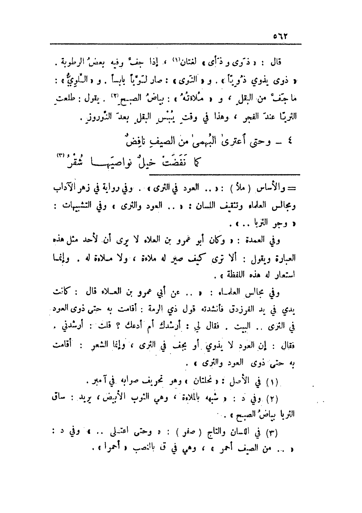 قال: "ذوى وذأى" لغتان، إذا جف وفيه بعض الرطوبة. "ذوى يذوي ذوياً". و"التوى": صار لوياً يابساً. و"اللوي": ما جف من البقل، و"ملاءته": بياض الصبح. يقول: طلعت الثريا عند الفجر، وهذا في وقت يبس البقل بعد النوروز.