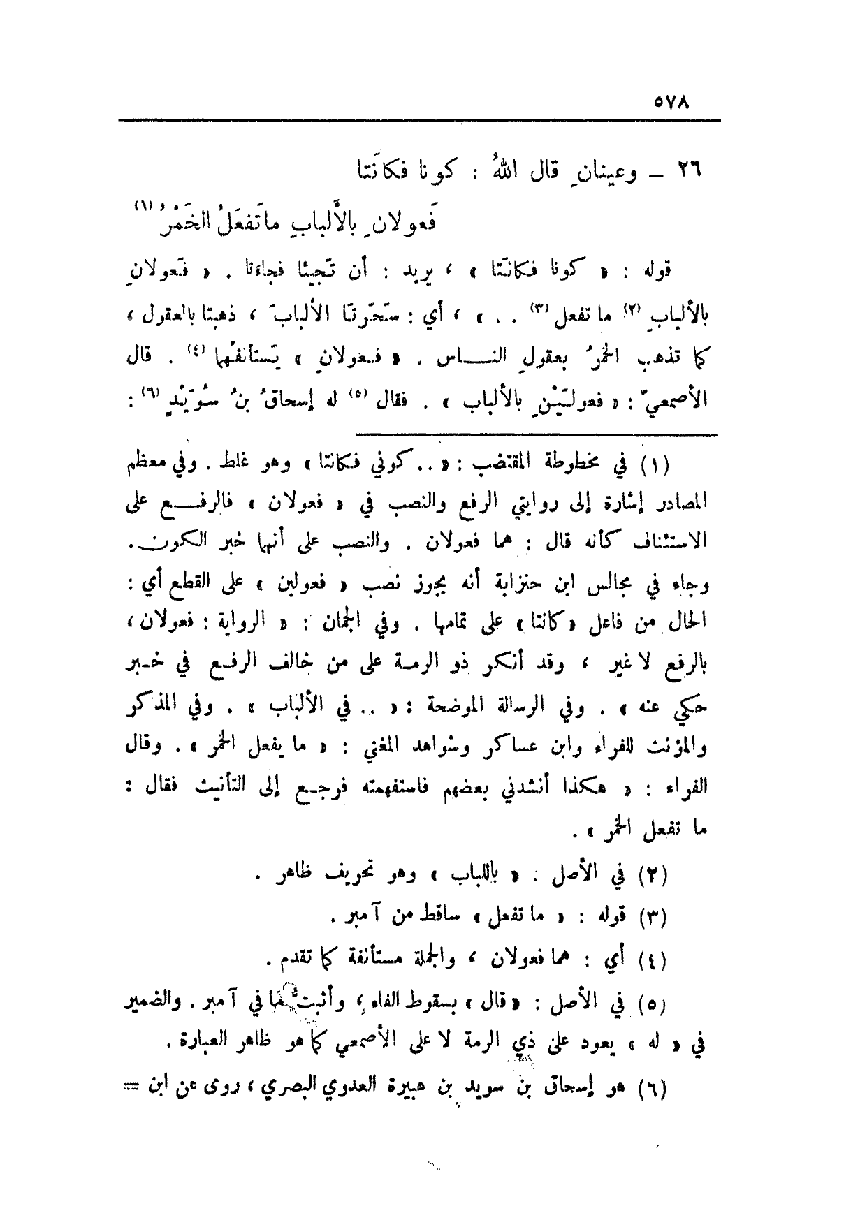 قوله: "كونا فكانتا"، يريد: أن تجيئا فجاءتا. "فعولان بالألباب ما تفعل .. "، أي: سحرنا الألباب، ذهبتا بالعقول، كما تذهب الخمر بعقول الناس. "فعولان" يستأنفهما. قال الأصمعي: "فعولين بالألباب". فقال له إسحاق بن سويدٍ: