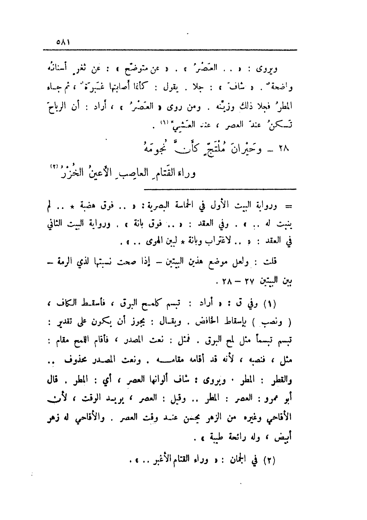 ويروى: " .. العصر". "عن متوضح": عن ثغرٍ أسنانه واضحةٌ. "شاف": جلا. يقول: كأنما أصابتها غبرةٌ، ثم جاء المطر فجلا ذلك وزينه. ومن روى "العصر"، أراد: أن الرياح تسكن عند العصر، عند العشي.