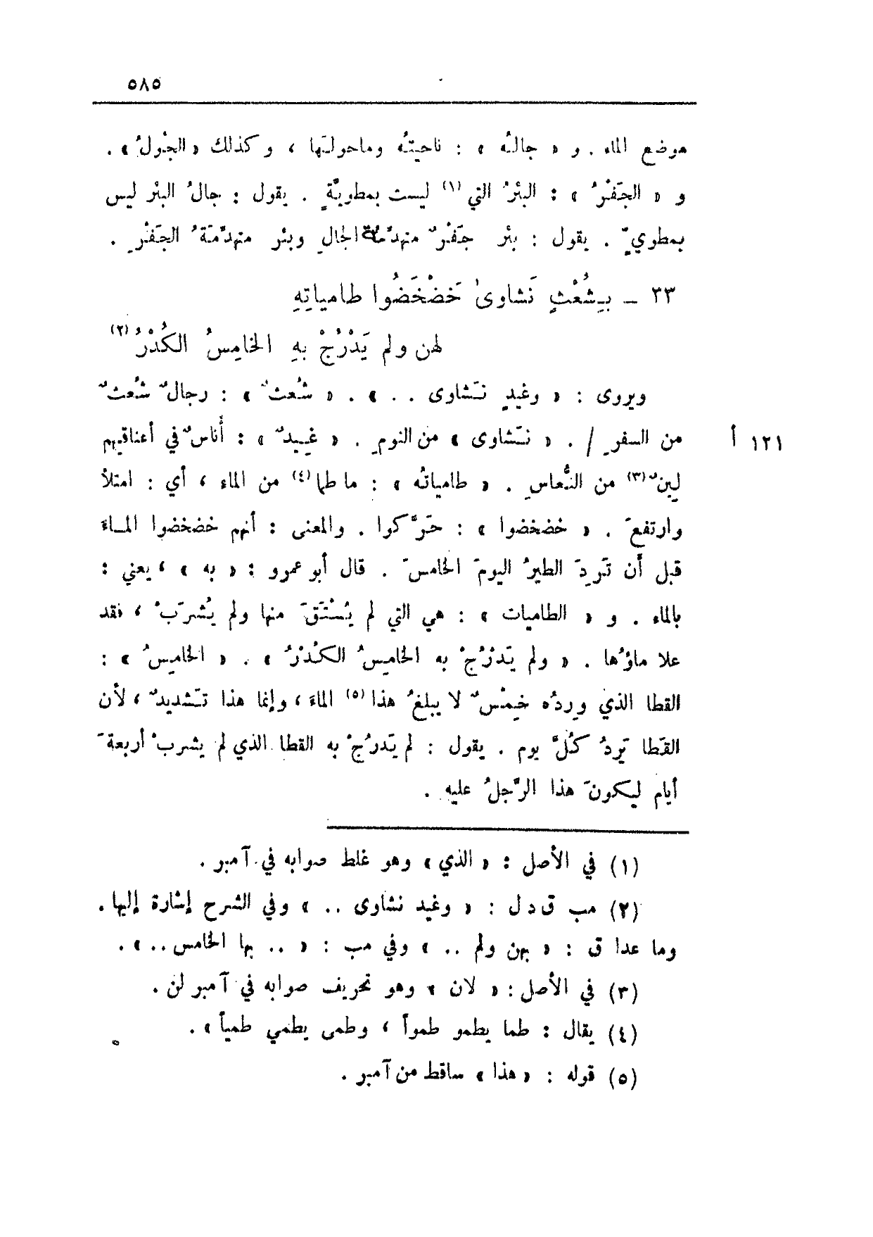 ويروى: "وغيدٍ نشاوى .. ". "شعثٌ": رجالٌ شعقٌ من السفر 121 أ/. "نشاوى" من النوم. "غيدٌ": أناسٌ في أعناقهم لينٌ من النعاس. "طامياته": ما طما من الماء، أي: امتلأ وارتفع. "خضخضوا": حركوا. والمعنى: أنهم خضخضوا الماء قبل أن ترد الطير اليوم الخامس. قال أبو عمرو: "به"، يعني: بالماء. و"الطاميات": هي التي لم يستق منها ولم يشرب، فقد علا ماؤها. "ولم يدرج به الخامس الكدر". "الخامس": القطا الذي ورده خمسٌ لا يبلغ هذا الماء، وإنما هذا تشديدٌ، لأن القطا يرد كل يوم. يقول: لم يدرج به القطا الذي لم يشرب أربعة أيام ليكون هذا الرجل عليه.