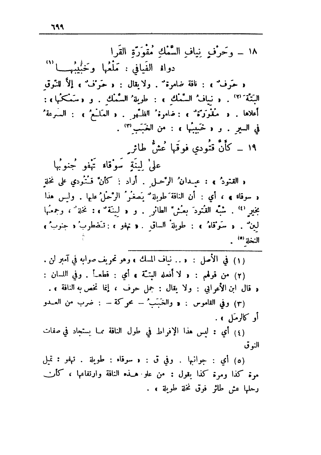 "حرف": ناقة ضامرة. ولا يقال: "حرف" إلا للنوق البتة. "نياف السمك": طويلة السمك. و"سمكها": أعلاها. "مقورة": ضامرة الظهر. "الملع": السرعة في السير. و"خبيبها": من الخبب.