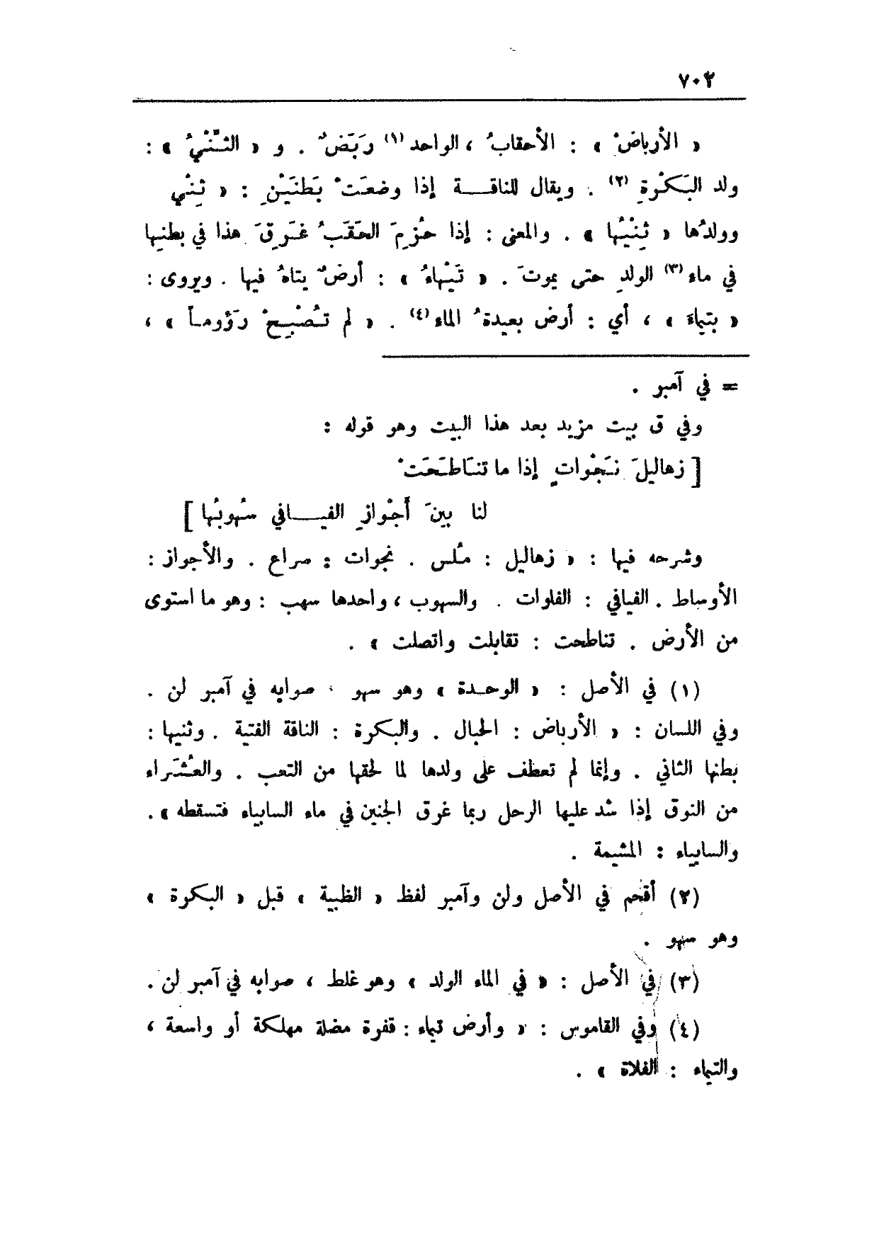 "الأرباض": الأحقاب، الواحد ربض. و"الثني": ولد البكرة. ويقال للناقة إذا وضعت بطنين: "ثني وولدها "ثنيها". والمعنى: إذا حزم الحقب غرق هذا في بطنها في ماء الولد حتى يموت. "تيهاء": أرض يتاه فيها. ويروى: "بتيماء"، أي: أرض بعيدة الماء. "لم تصبح رؤوماً"،