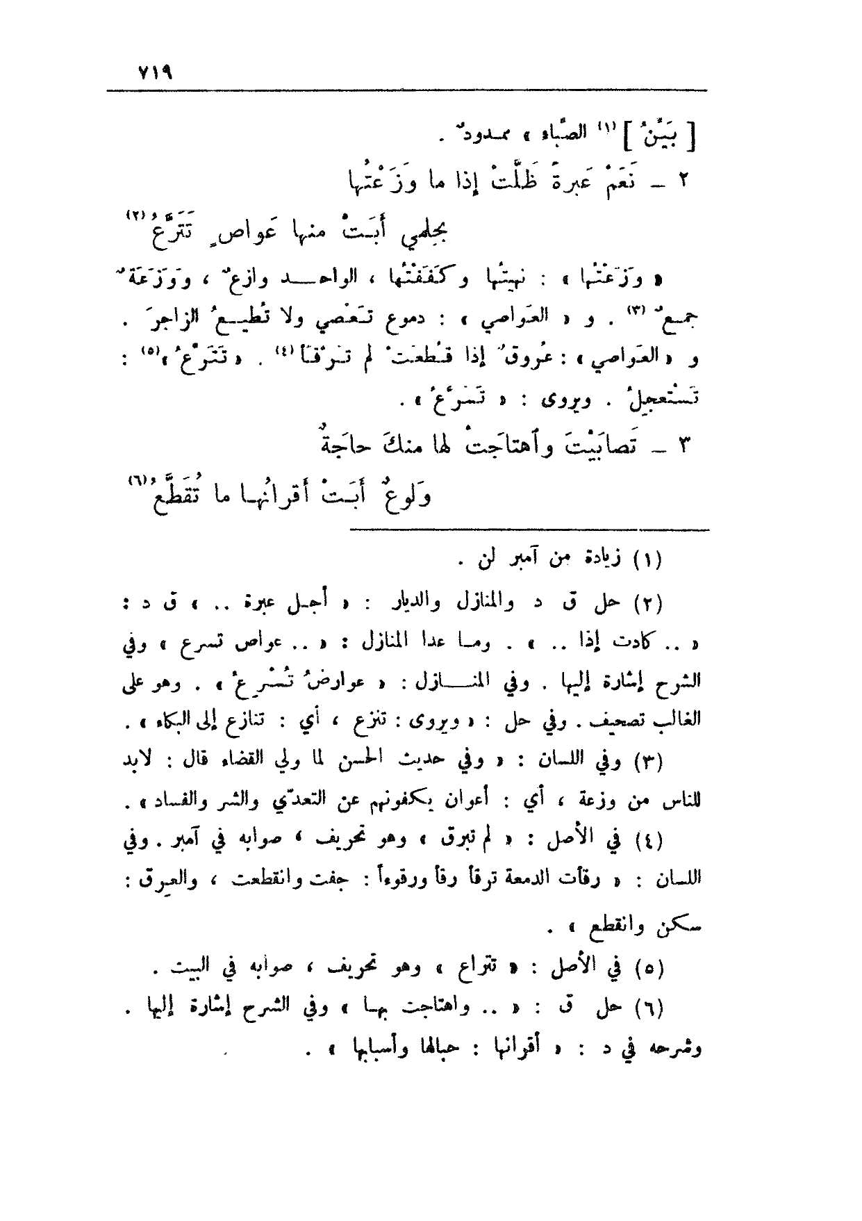 "وزعتها": نهيتها وكففتها، الواحد وازع، ووزعة جمع. و"العواصي": دموع تعصي ولا تطيع الزاجر. و"العواصي": عروق إذا قطعت لم ترقأ. "تترع": تستعجل. ويروى: "تسرع".
