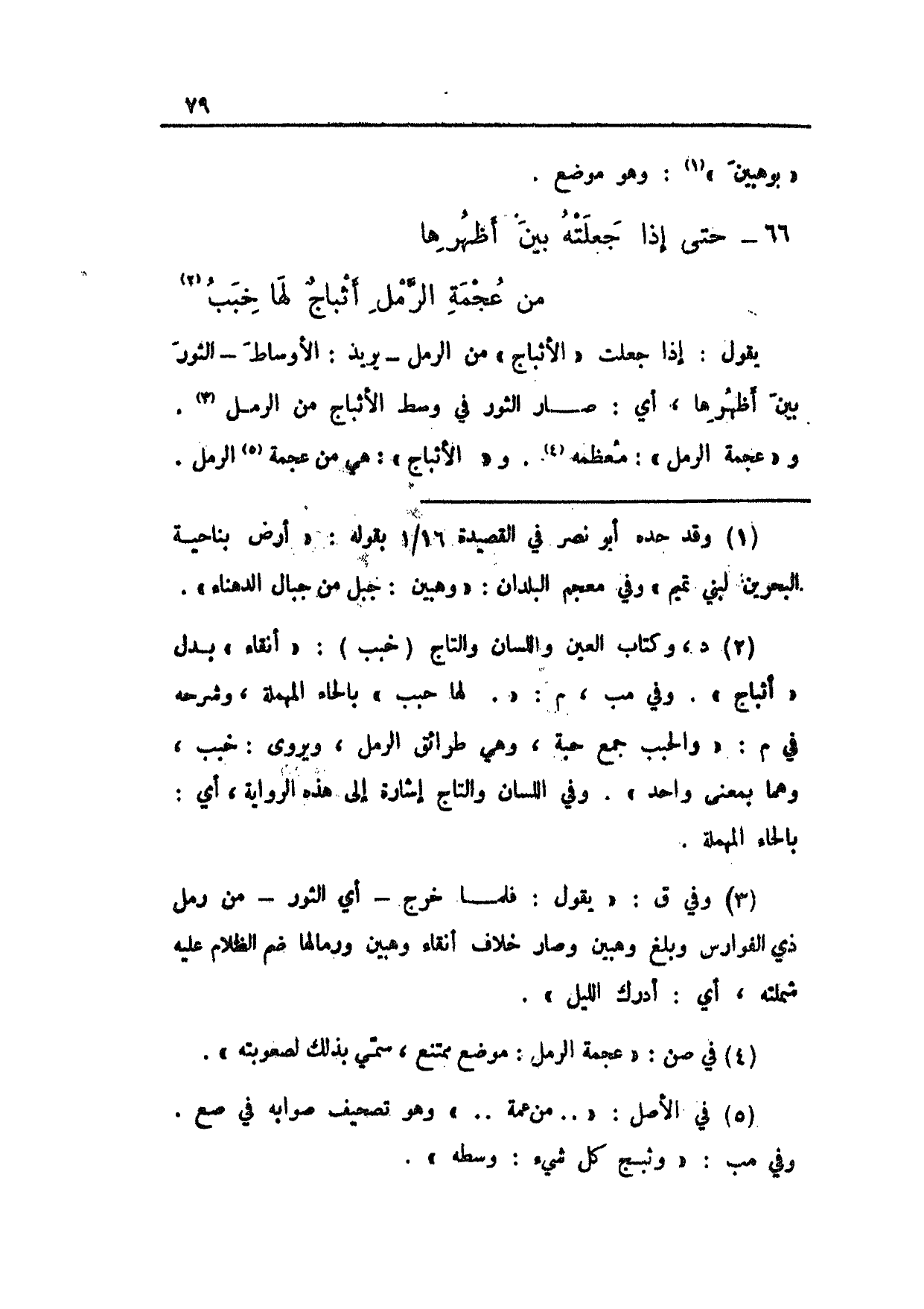 يقول: إذا جعلت "الأثباج" من الرمل- يريد: الأوساط- الثور بين أظهرها، أي: صار الثور في وسط الأثباج من الرمل. و"عجمة الرمل": معظمه. و"الأثباج": هي من عجمة الرمل.